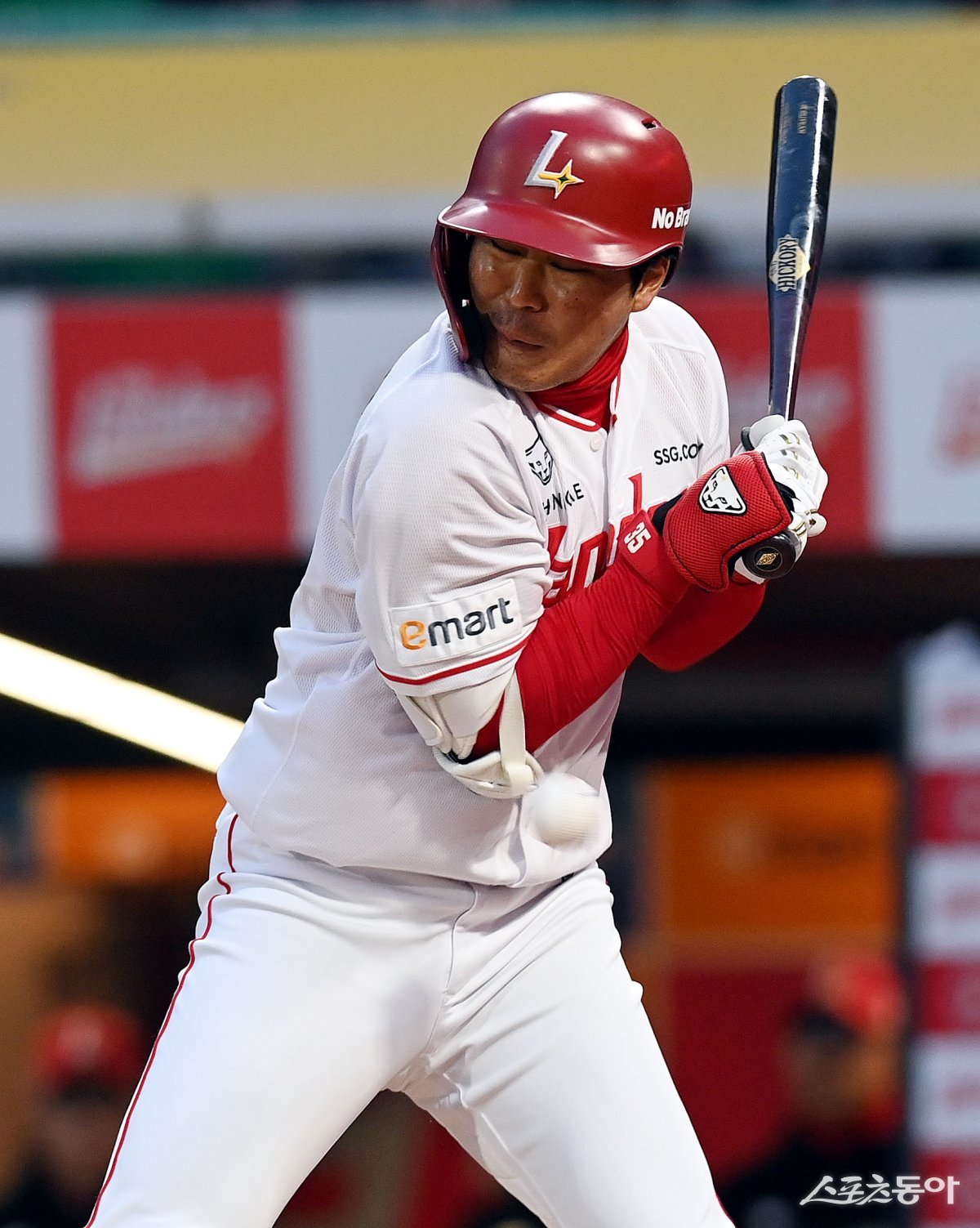 27일 인천 SSG 랜더스필드에서 ‘2024 신한 SOL 뱅크 KBO리그’ SSG 랜더스와 한화 이글스의 경기가 열렸다. 1회말 2사 1루에서 SSG 한유섬이 투구에 맞고 있다.
