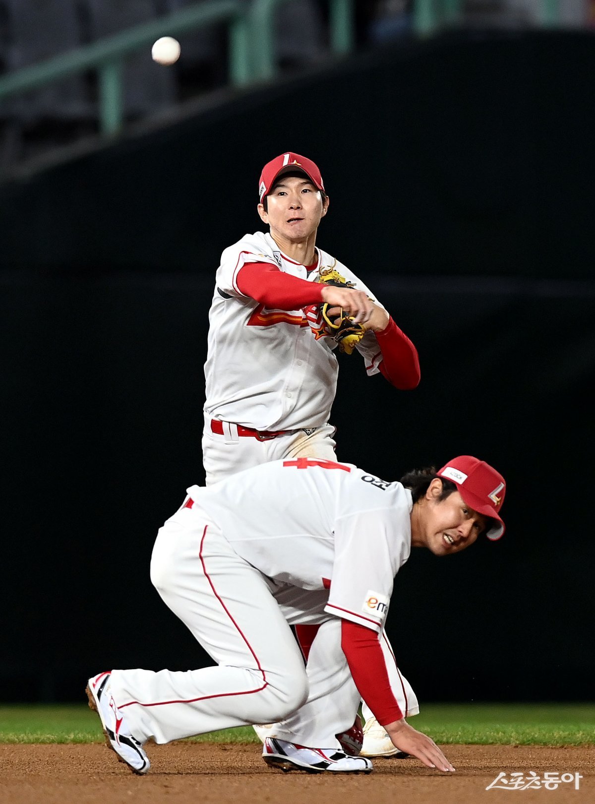 27일 인천 SSG 랜더스필드에서 ‘2024 신한 SOL 뱅크 KBO리그’ SSG 랜더스와 한화 이글스의 경기가 열렸다. 5회초 1사에서 SSG 박성한이 타구를 잡아 1루로 송구하고 있다.