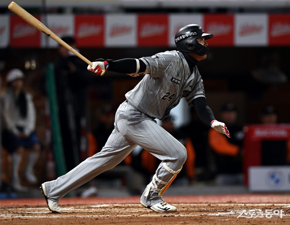 27일 인천 SSG 랜더스필드에서 ‘2024 신한 SOL 뱅크 KBO리그’ SSG 랜더스와 한화 이글스의 경기가 열렸다. 4회초 무사 1루에서 한화 임종찬이 1타점 2루타를 날리고 있다.