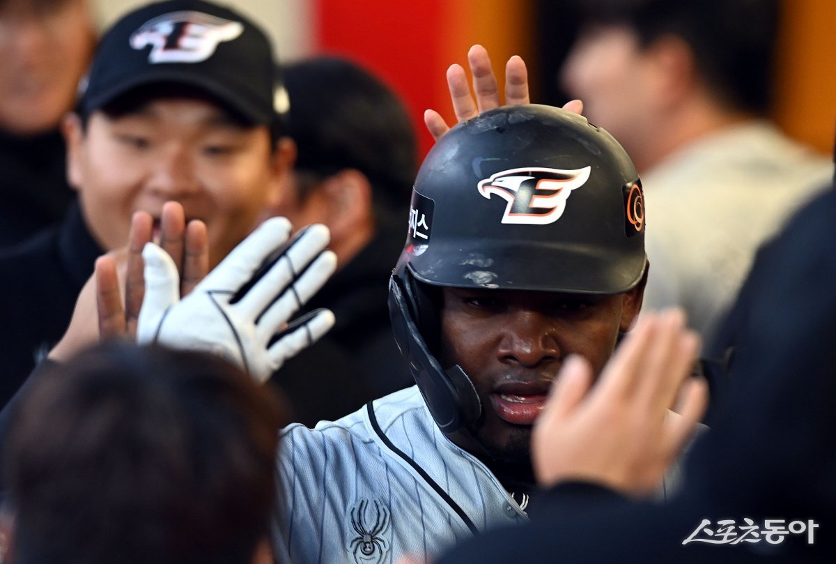 27일 인천 SSG 랜더스필드에서 ‘2024 신한 SOL 뱅크 KBO리그’ SSG 랜더스와 한화 이글스의 경기가 열렸다. 1회초 1사 3루에서 볼넷 때 폭투로 득점을 올린 한화 페라자가 동료들의 환영을 받고 있다.