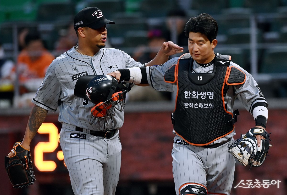 27일 인천 SSG 랜더스필드에서 ‘2024 신한 SOL 뱅크 KBO리그’ SSG 랜더스와 한화 이글스의 경기가 열렸다. 한화 선발투수 산체스가 1회말 SSG 공격을 무실점으로 막은 후 최재훈과 이야기를 나누고 있다.