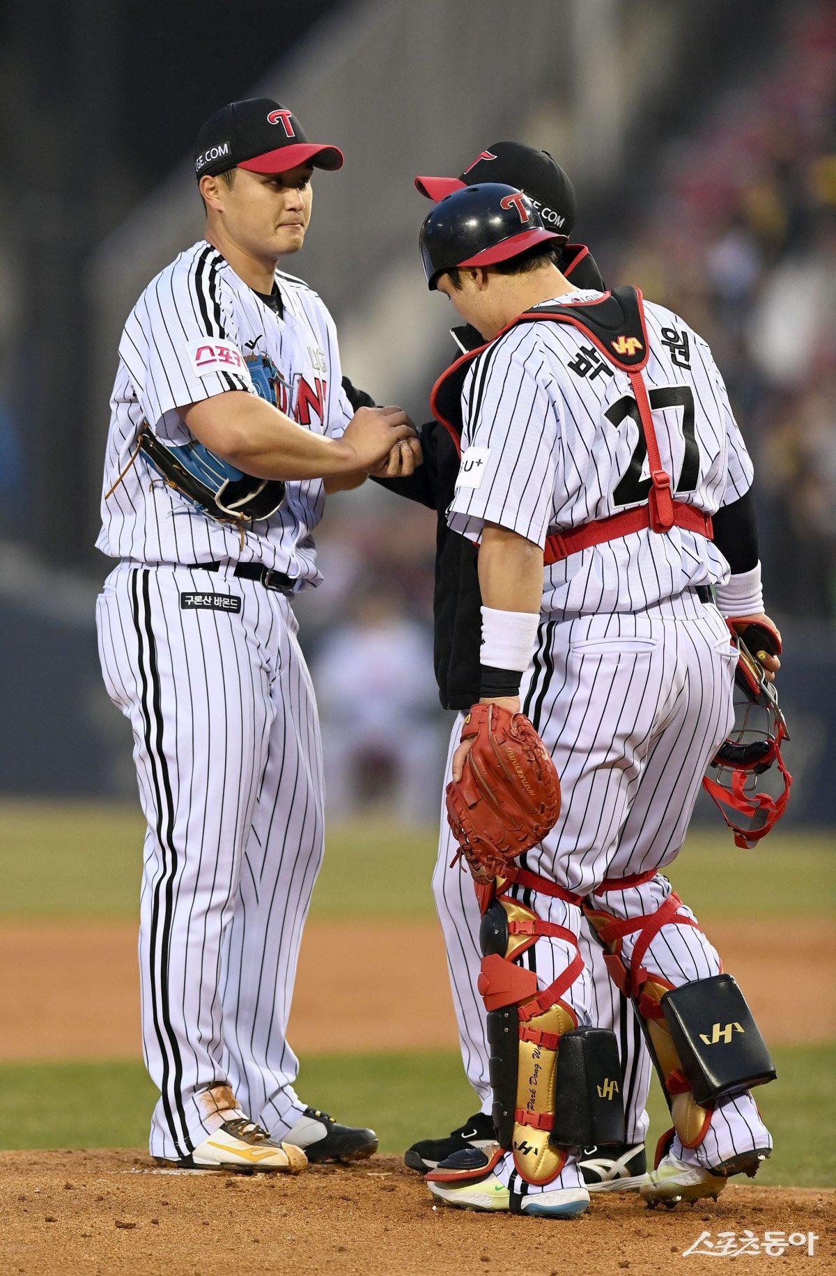 27일 서울 잠실야구장에서 ‘2024 신한은행 SOL뱅크 KBO리그’ 삼성 라이온즈와 LG 트윈스 경기가 열렸다. 선발 투수로 등판한 LG 최원태가 1회초 2사 만루 상황에서 투수코치와 이야기하고 있다.