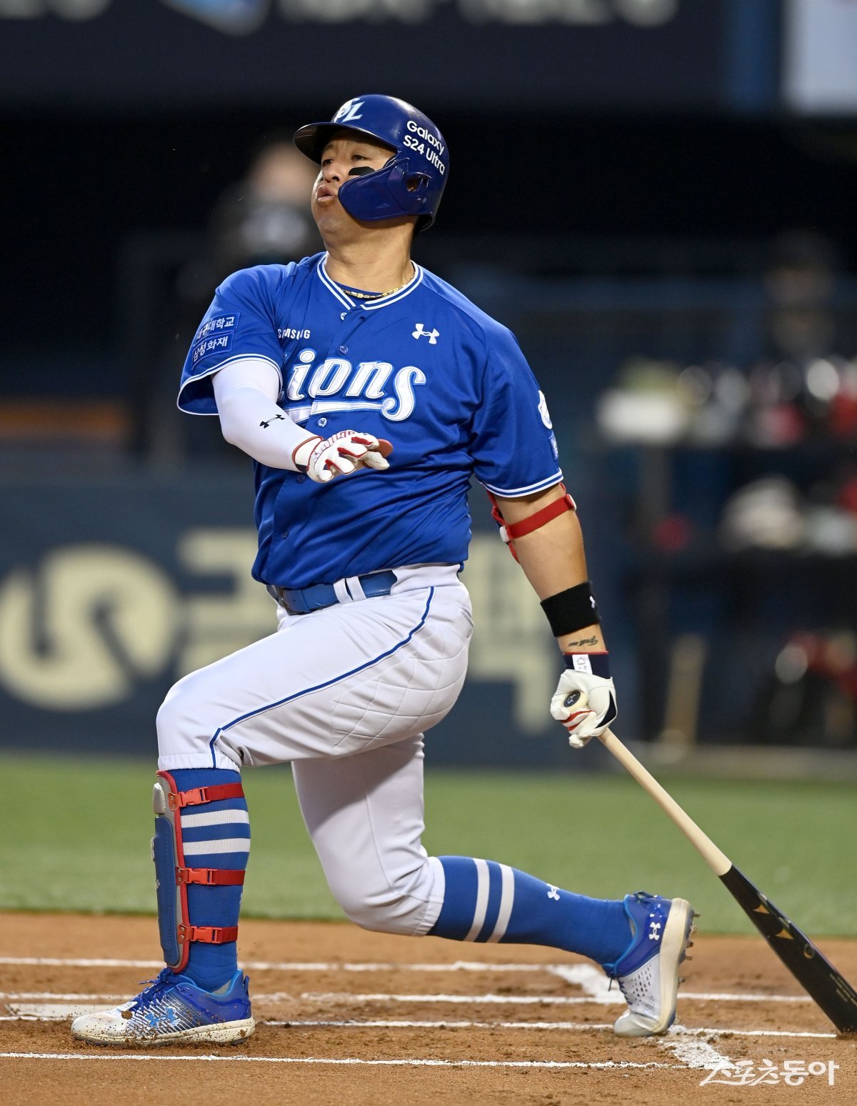 27일 서울 잠실야구장에서 ‘2024 신한은행 SOL뱅크 KBO리그’ 삼성 라이온즈와 LG 트윈스 경기가 열렸다. 1회초 2사 만루 삼성 강민호가 타격을 하고 있다.