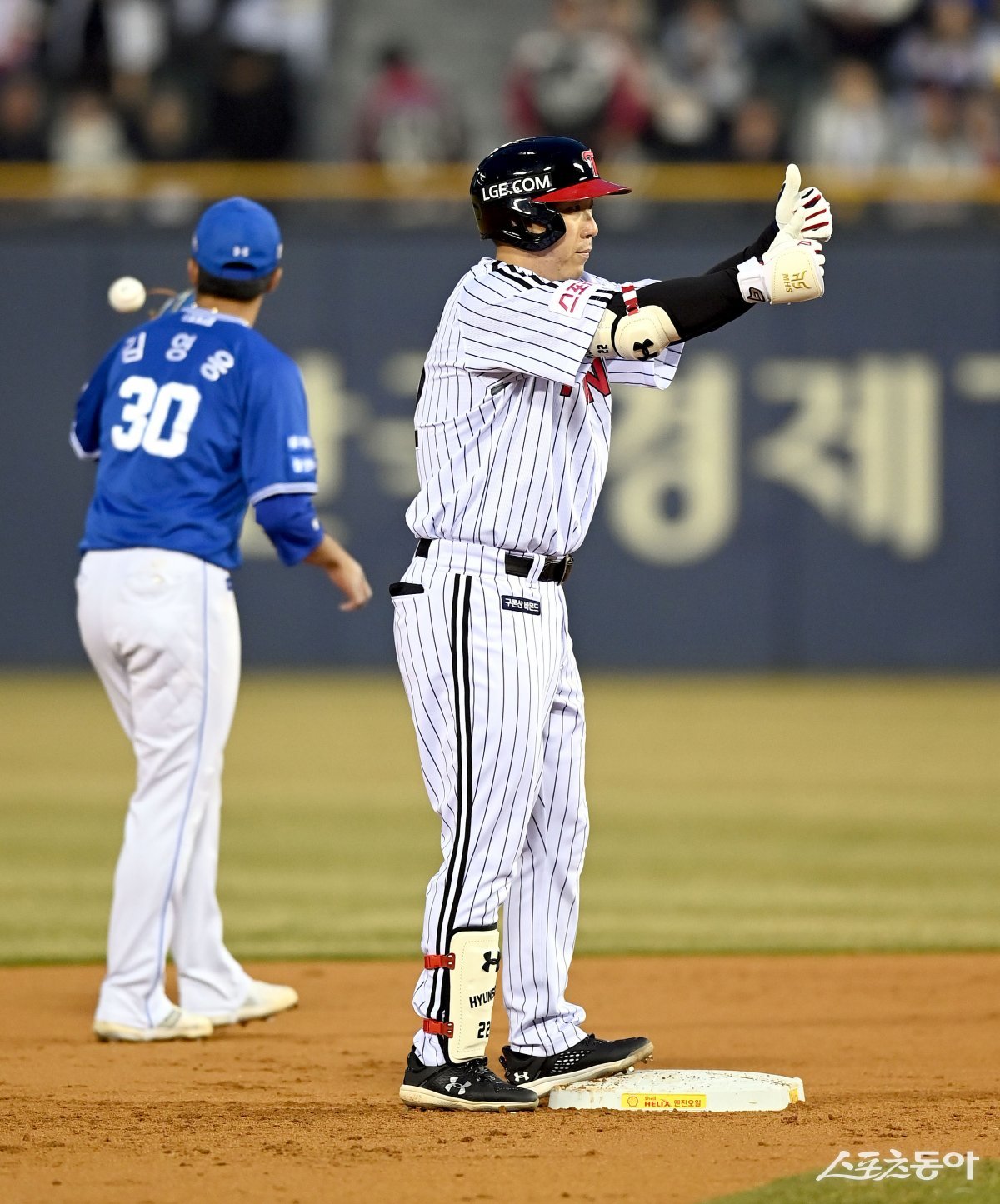 27일 서울 잠실야구장에서 ‘2024 신한은행 SOL뱅크 KBO리그’ 삼성 라이온즈와 LG 트윈스 경기가 열렸다. 1회말 1사 2루 LG 김현수가 선제 1타점 중전 2루타를 치고 2루에서 기뻐하고 있다.