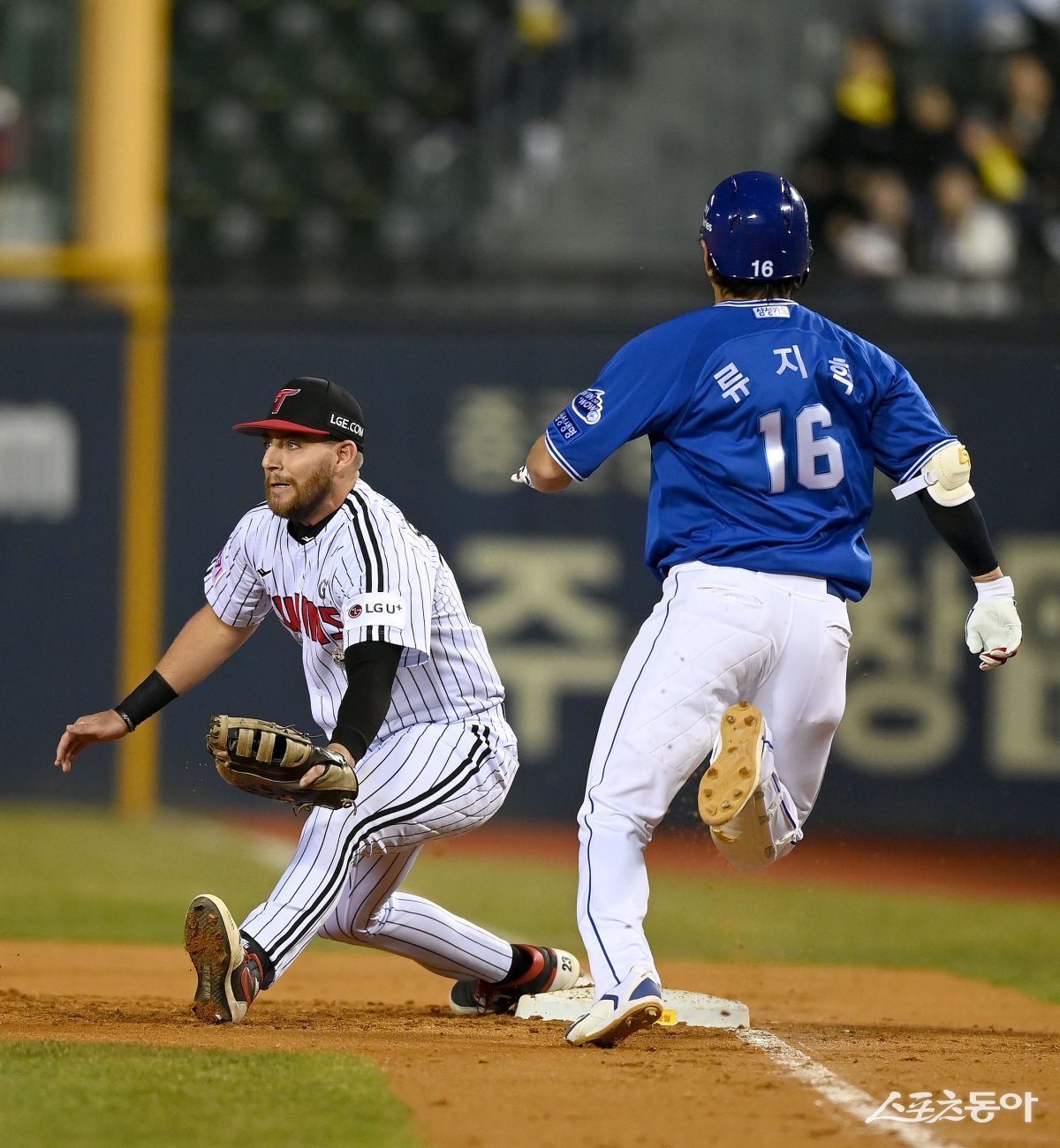 27일 서울 잠실야구장에서 ‘2024 신한은행 SOL뱅크 KBO리그’ 삼성 라이온즈와 LG 트윈스 경기가 열렸다. 2회초 무사 삼성 류지혁이 내야 안타를 치고 1루에서 세이프 되고 있다.