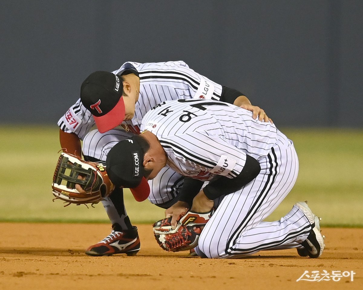 27일 서울 잠실야구장에서 ‘2024 신한은행 SOL뱅크 KBO리그’ 삼성 라이온즈와 LG 트윈스 경기가 열렸다. 2회초 무사 1루 상황에서 삼성 1루주자 류지혁이 2루 도루를 하다 LG 오지환과 충돌해 부상을 당하고 있다. 오지환이 고통을 호소하고 있다.