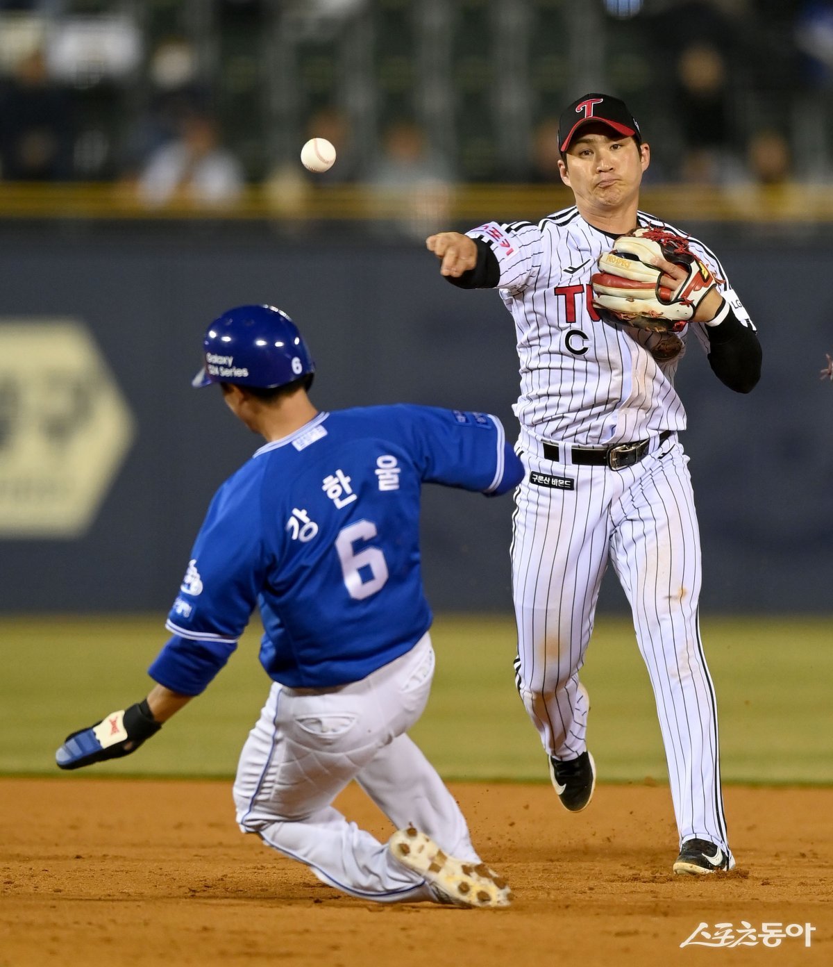 27일 서울 잠실야구장에서 ‘2024 신한은행 SOL뱅크 KBO리그’ 삼성 라이온즈와 LG 트윈스 경기가 열렸다. 4회초 1사 1루 삼성 내야 땅볼 때 LG 오지환이 1루주자를 포스 아웃시킨 후 1루로 송구하고 있다.