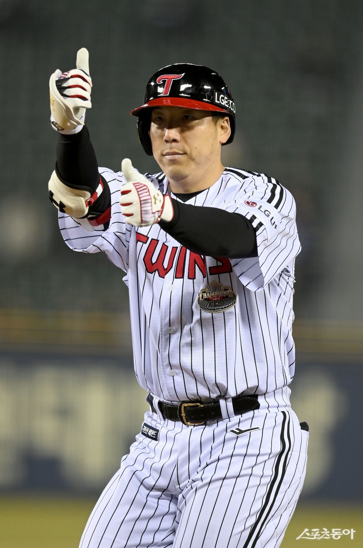27일 서울 잠실야구장에서 ‘2024 신한은행 SOL뱅크 KBO리그’ 삼성 라이온즈와 LG 트윈스 경기가 열렸다. 5회말 2사 1루 LG 김현수가 우전 안타를 치고 1루에서 기뻐하고 있다.