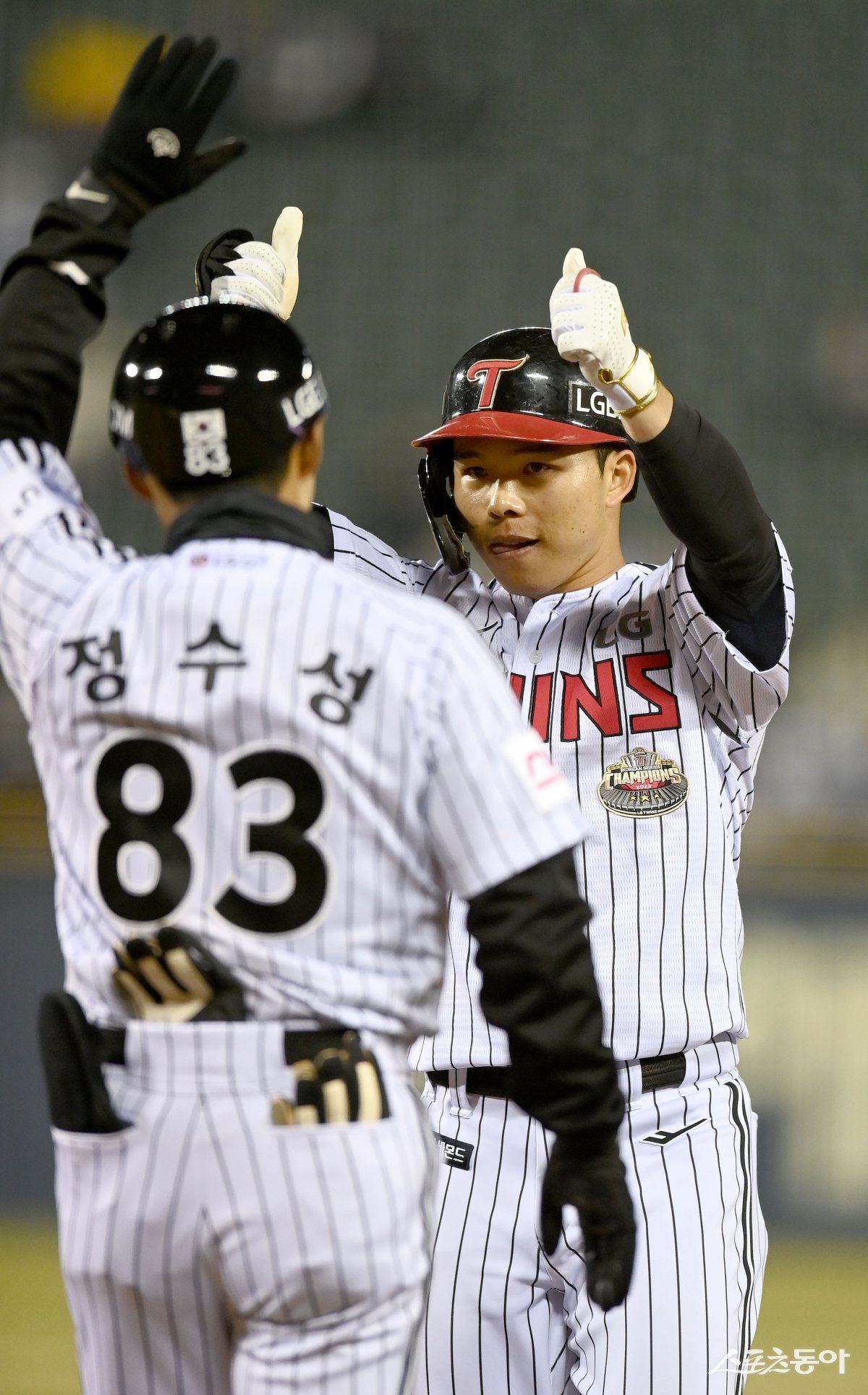 27일 서울 잠실야구장에서 ‘2024 신한은행 SOL뱅크 KBO리그’ 삼성 라이온즈와 LG 트윈스 경기가 열렸다. 6회말 2사 3루 LG 문성주가 동점 적시타를 치고 1루에서 기뻐하고 있다.