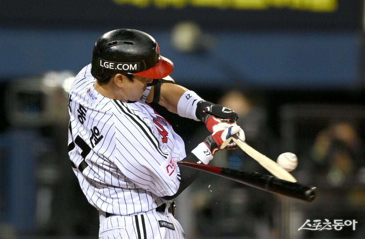 27일 서울 잠실야구장에서 ‘2024 신한은행 SOL뱅크 KBO리그’ 삼성 라이온즈와 LG 트윈스 경기가 열렸다. 6회말 1사 3루 LG 박동원이 타격 중 배트가 부러지고 있다.