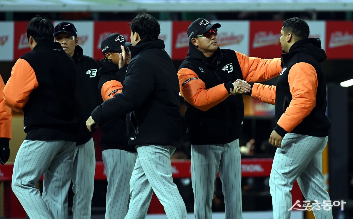 27일 인천 SSG 랜더스필드에서 ‘2024 신한 SOL 뱅크 KBO리그’ SSG 랜더스와 한화 이글스의 경기가 열렸다. 한화가 SSG를 상대로 3-1 승리 후 최원호 감독이 산체스를 환영하고 있다.