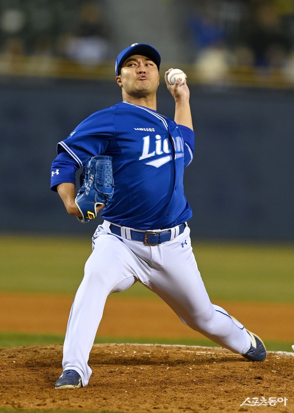 27일 서울 잠실야구장에서 ‘2024 신한은행 SOL뱅크 KBO리그’ 삼성 라이온즈와 LG 트윈스 경기가 열렸다. 교체 등판한 삼성 최성훈이 역투하고 있다.