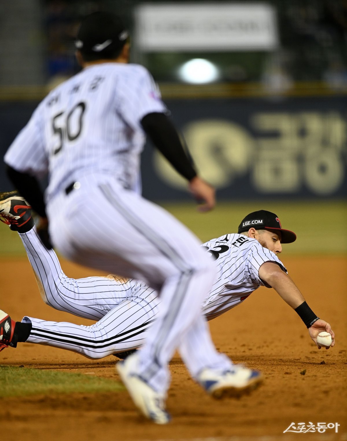 27일 서울 잠실야구장에서 ‘2024 신한은행 SOL뱅크 KBO리그’ 삼성 라이온즈와 LG 트윈스 경기가 열렸다. 7회초 1사 1루 LG 오스틴이 포구 실책을 한 후 다시 잡아 1루로 공을 던지고 있다.