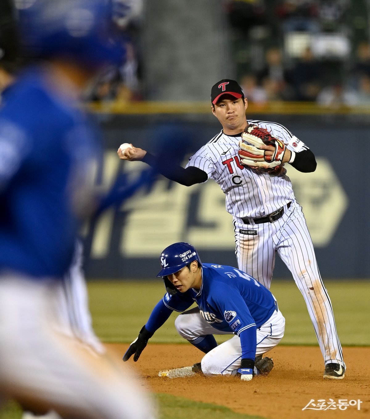 27일 서울 잠실야구장에서 ‘2024 신한은행 SOL뱅크 KBO리그’ 삼성 라이온즈와 LG 트윈스 경기가 열렸다. 9회초 1사 1루 삼성 내야 땅볼 때 LG 오지환이 1루주자를 아웃시키고 있다.