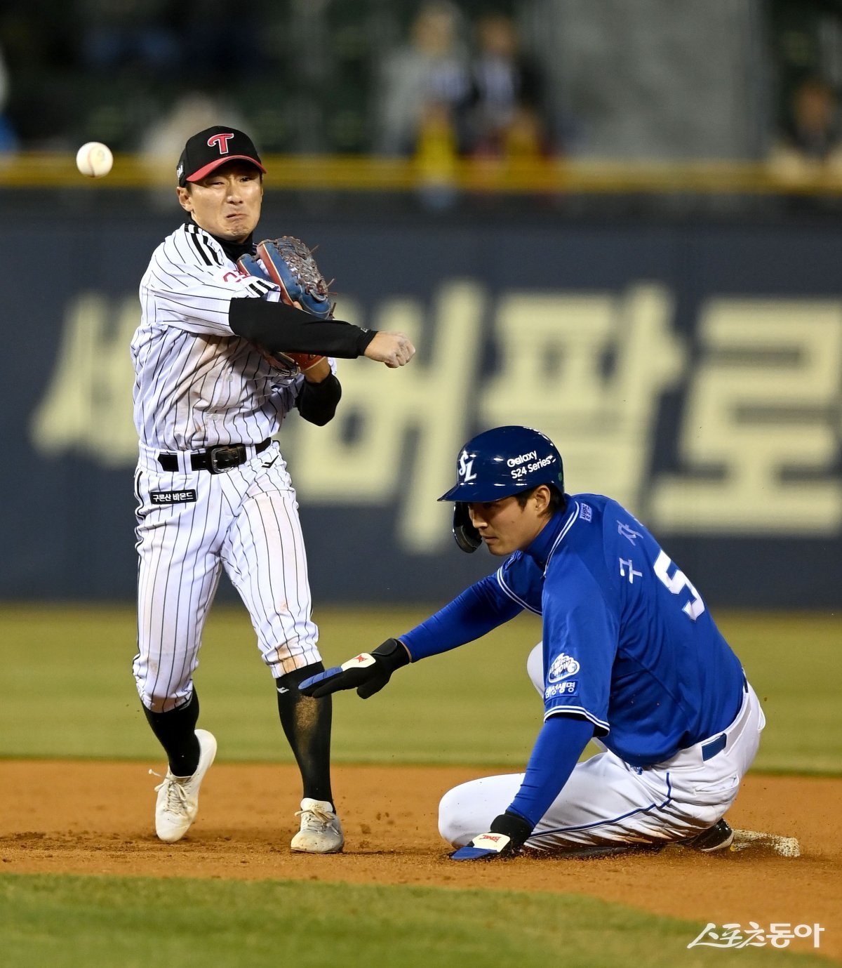 27일 서울 잠실야구장에서 ‘2024 신한은행 SOL뱅크 KBO리그’ 삼성 라이온즈와 LG 트윈스 경기가 열렸다. 연장 12뢰초 1사 1,2루 삼성 내야 땅볼 때 LG 신민재가 1루주자를 포스 아웃시킨 후 1루로 송구하고 있다.