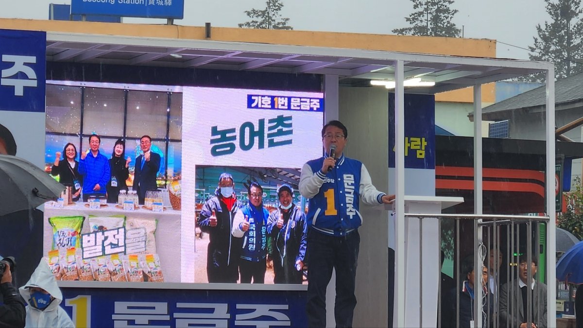 문금주 제22대 총선 더불어민주당 고흥·보성·장흥·강진 국회의원 후보가 28일 전남 보성군 보성역 앞에서 유세를 진행하고 있다.