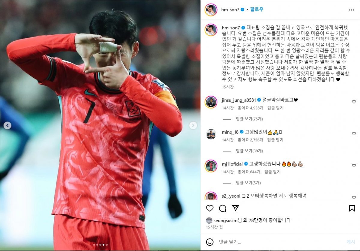 곧장 영국으로 이동한 그는 27일 자신의 소셜미디어(SNS)를 통해 “어려운 분위기 속에서 각자 개인적 마음들은 접어두고 팀을 위해 헌신하는 마음과 노력이 주장으로서 자랑스러웠다”며 단합된 대표팀 분위기를 강조했다. 팬들에게 감사인사도 잊지 않았다. “춥고 더운 날씨였는데 팬들의 사랑 덕분에 따뜻하고 시원했다”며 “‘감사하다’는 말로 부족할 정도로 감사하다”고 덧붙였다.