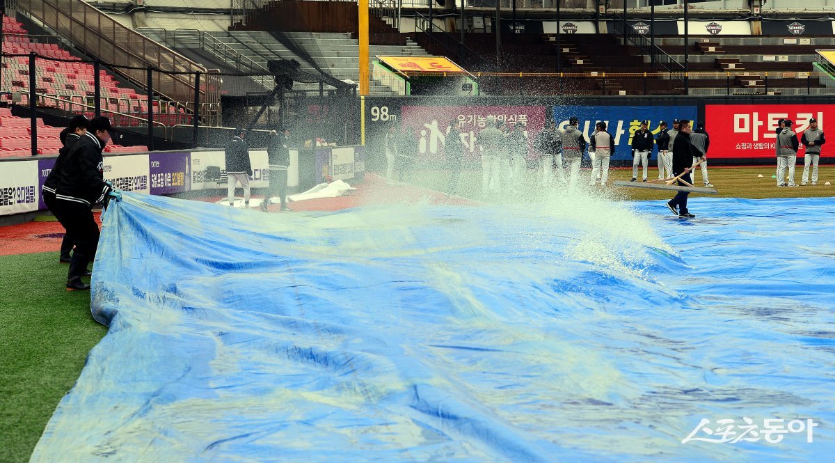 28일 경기도 수원 KT위즈파크에서 ‘2024 신한 SOL 뱅크 KBO리그’ KT 위즈와 두산 베어스의 경기가 열린다. 경기 전 KT 관계자들이 흠뻑 젖은 그라운드를 정리하고 있다.