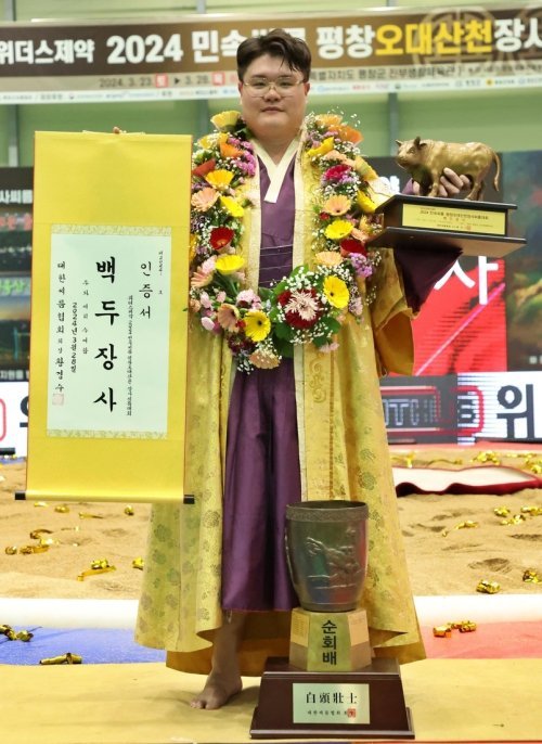 장성우는 28일 강원 평창 진부생활체육관에서 열린 위더스제약 2024 민속씨름 평창오대산천장사씨름대회 백두급(140kg 이하) 백두장사 결정전(5판3승제)에서 차승진(구미시청)을 3-1로 꺾었다.