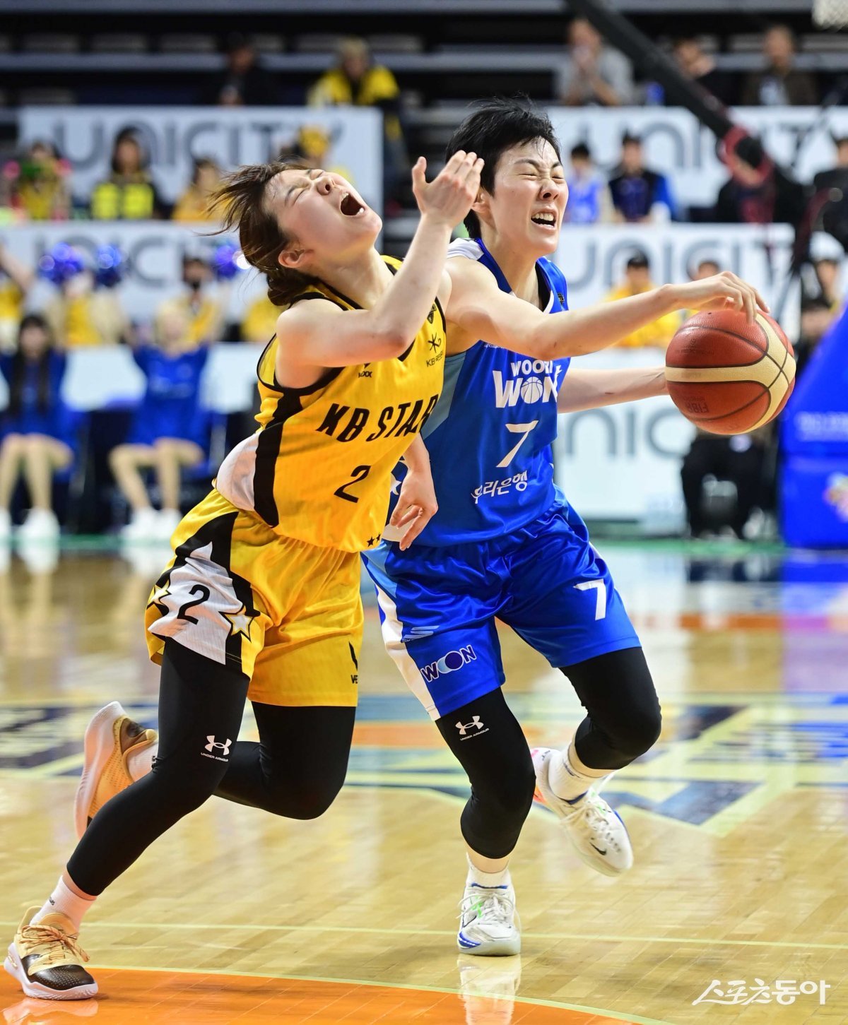 28일 충남 아산이순신체육관에서 열린 ‘우리은행 우리WON 2023-2024 여자프로농구’ 챔피언 결정전 3차전 아산 우리은행과 청주 KB의 경기에서 KB 허예은이 우리은행 박혜진을 수비하고 있다.