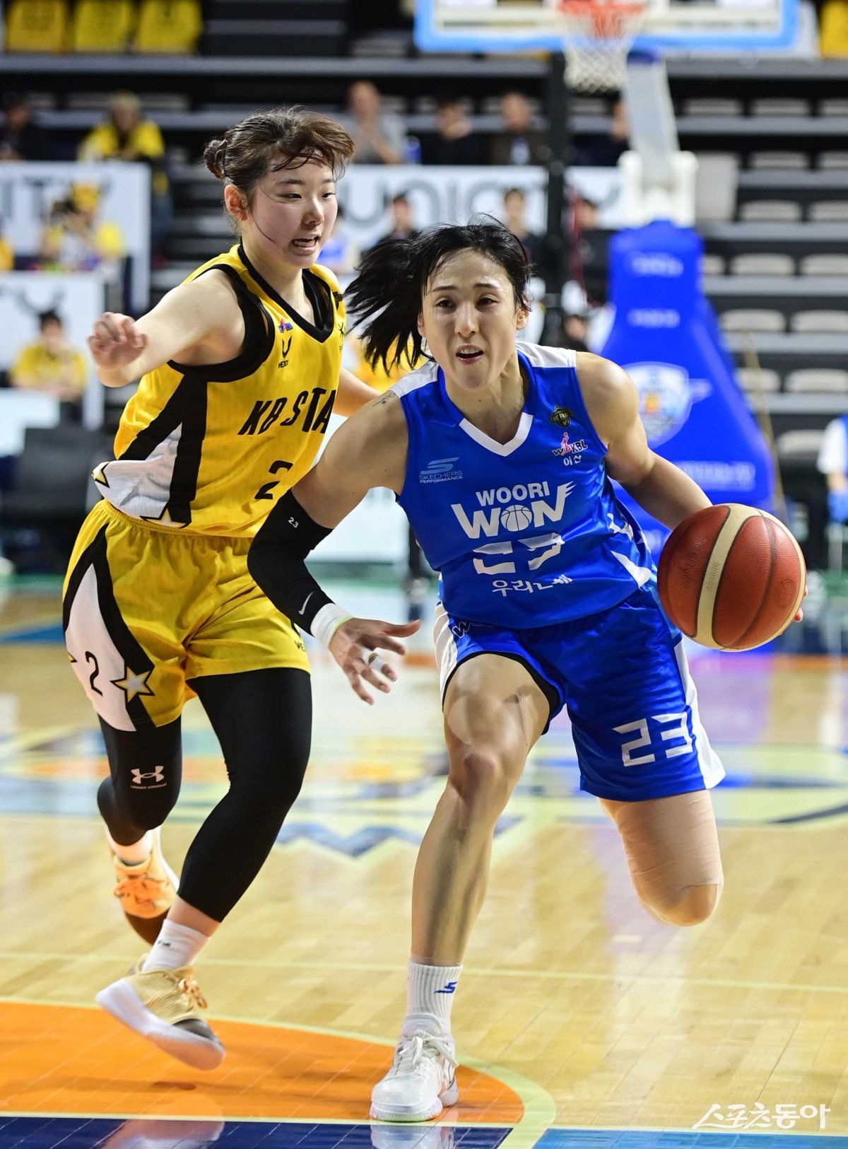 28일 충남 아산이순신체육관에서 열린 ‘우리은행 우리WON 2023-2024 여자프로농구’ 챔피언 결정전 3차전 아산 우리은행과 청주 KB의 경기에서 우리은행 김단비가 KB 허예은의 수비를 뚫고 드리블 돌파를 하고 있다.