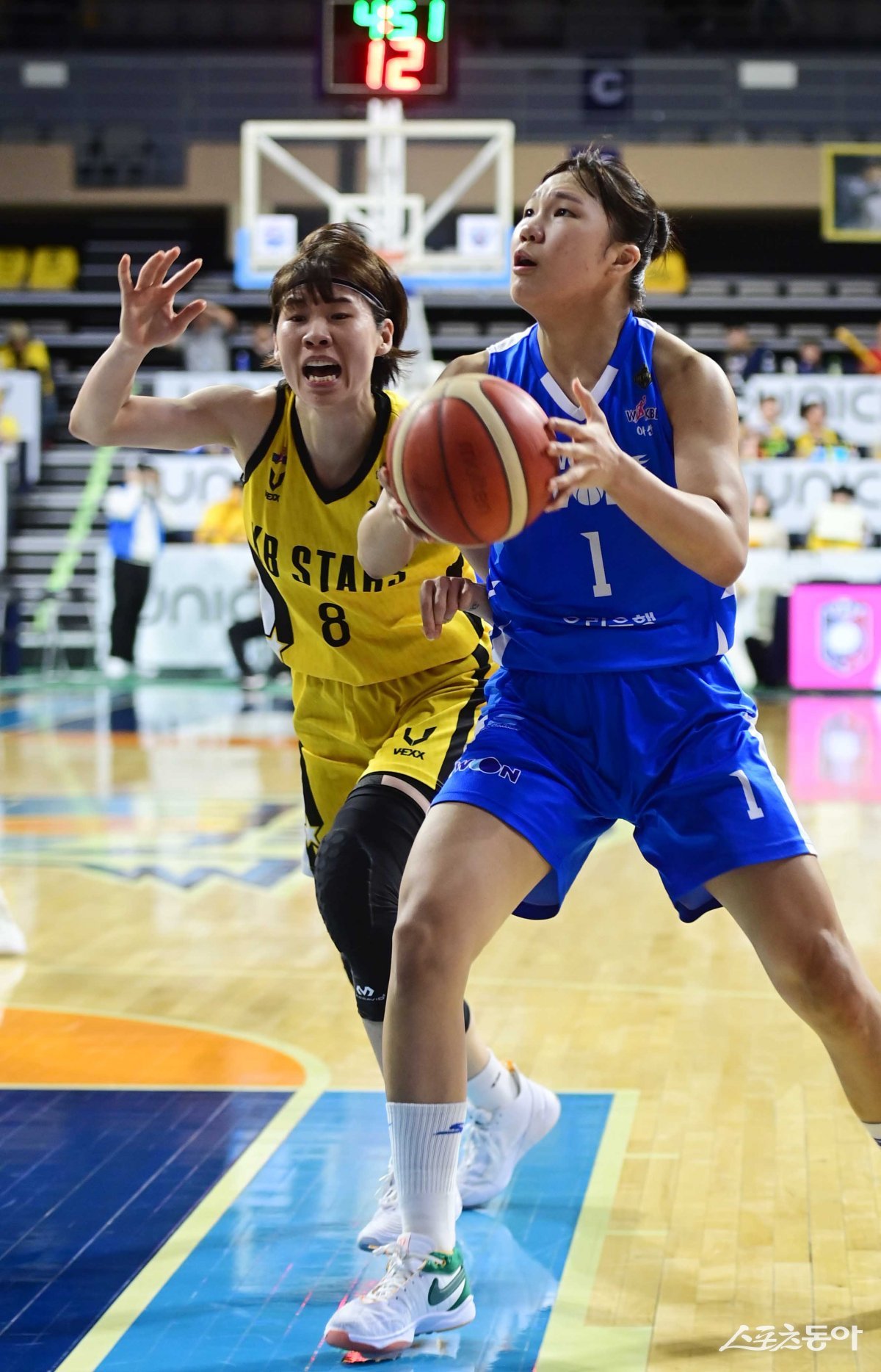 28일 충남 아산이순신체육관에서 열린 ‘우리은행 우리WON 2023-2024 여자프로농구’ 챔피언 결정전 3차전 아산 우리은행과 청주 KB의 경기에서 우리은행 박지현이 KB 김민정의 수비를 뚫고 슛을 하고 있다.