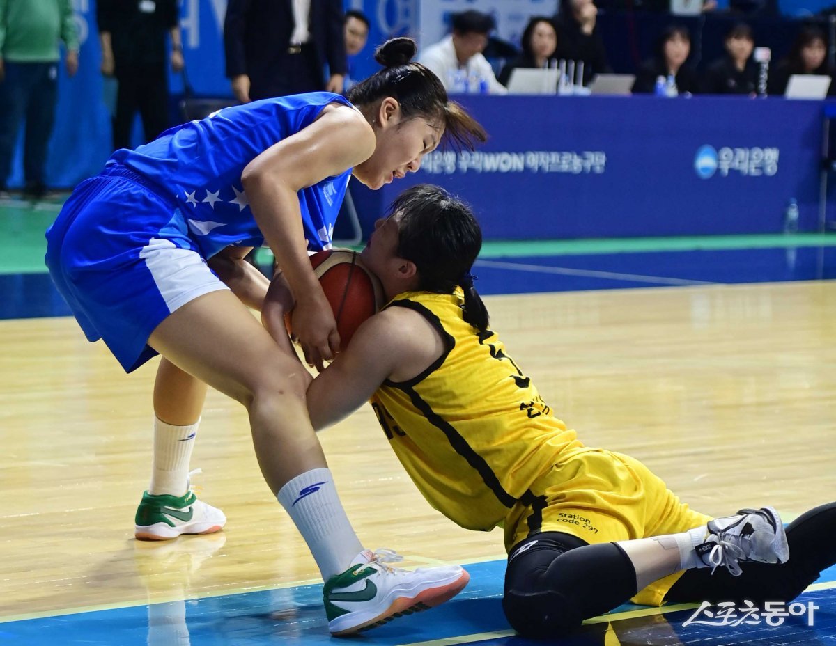 28일 충남 아산이순신체육관에서 열린 ‘우리은행 우리WON 2023-2024 여자프로농구’ 챔피언 결정전 3차전 아산 우리은행과 청주 KB의 경기에서 우리은행 박지현과 KB 심성영이 루즈볼을 다투고 있다.