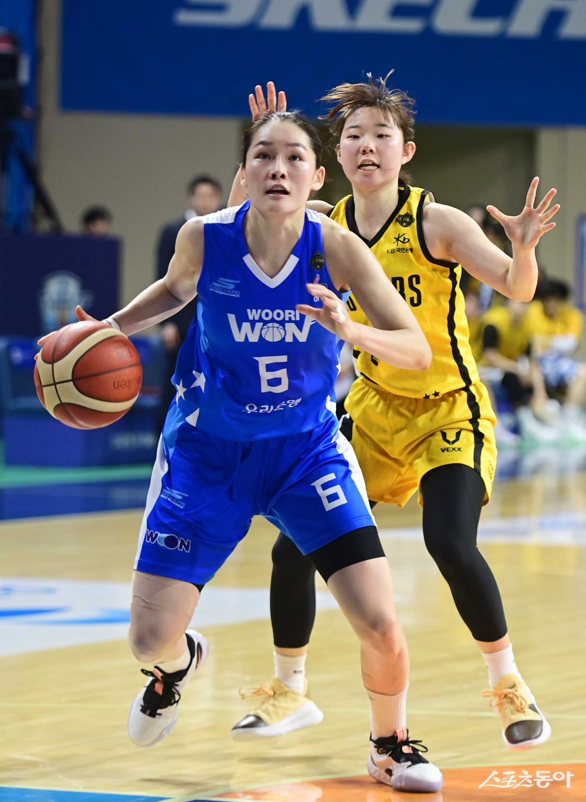 28일 충남 아산이순신체육관에서 열린 ‘우리은행 우리WON 2023-2024 여자프로농구’ 챔피언 결정전 3차전 아산 우리은행과 청주 KB의 경기에서 우리은행 최이샘이 KB 허예은의 수비를 뚫고 드리블 돌파를 하고 있다.