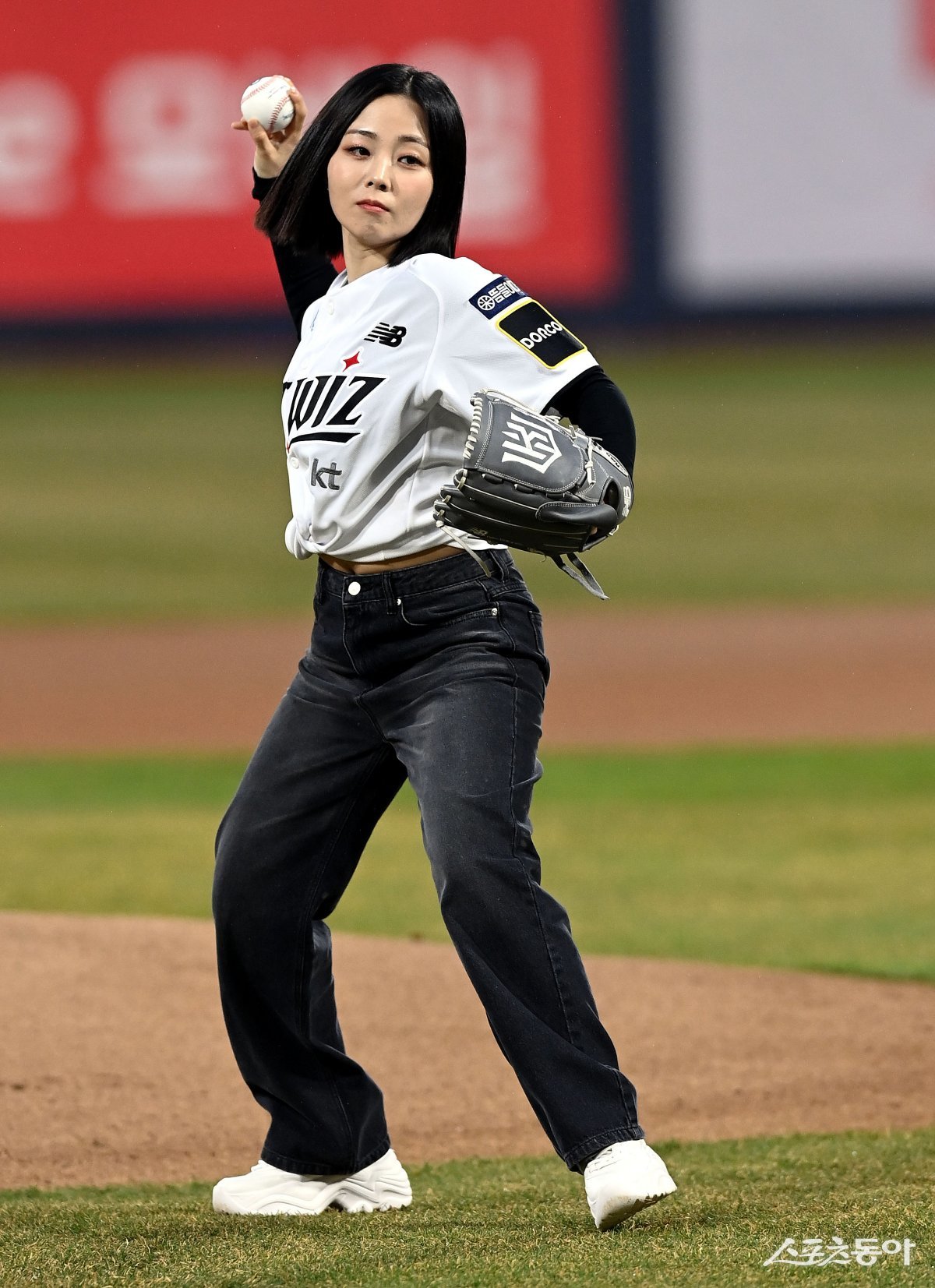 28일 경기도 수원 KT위즈파크에서 ‘2024 신한 SOL 뱅크 KBO리그’ KT 위즈와 두산 베어스의 경기가 열렸다. 경기에 앞서 가수 박혜원이 시구를 던지고 있다.