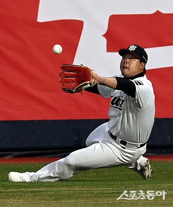 28일 경기도 수원 KT위즈파크에서 ‘2024 신한 SOL 뱅크 KBO리그’ KT 위즈와 두산 베어스의 경기가 열렸다. 1회초 1사에서 KT 강백호가 플라이 타구를 잡아내고 있다.