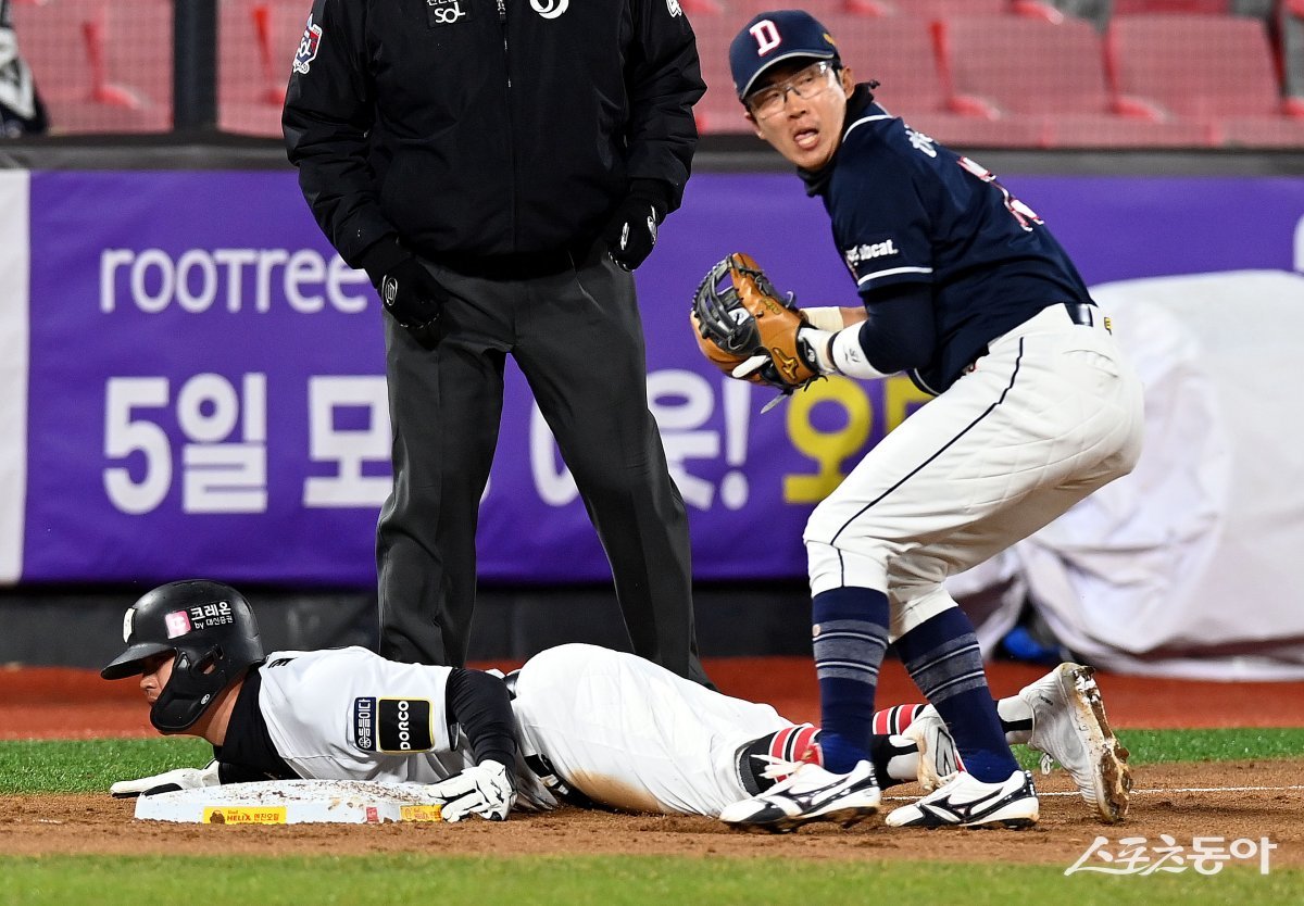 28일 경기도 수원 KT위즈파크에서 ‘2024 신한 SOL 뱅크 KBO리그’ KT 위즈와 두산 베어스의 경기가 열렸다. 3회말 무사 1루에서 안타 때 KT 1루 주자 배정대가 3루까지 달려 세이프되고 있다.