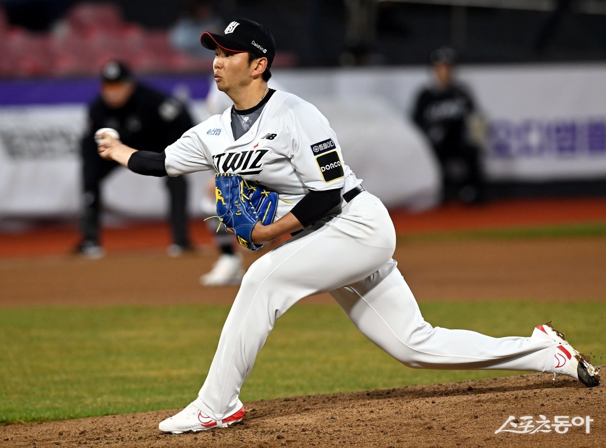 28일 경기도 수원 KT위즈파크에서 ‘2024 신한 SOL 뱅크 KBO리그’ KT 위즈와 두산 베어스의 경기가 열렸다. 4회초 무사에서 KT 이선우가 구원 등판해 볼을 던지고 있다.