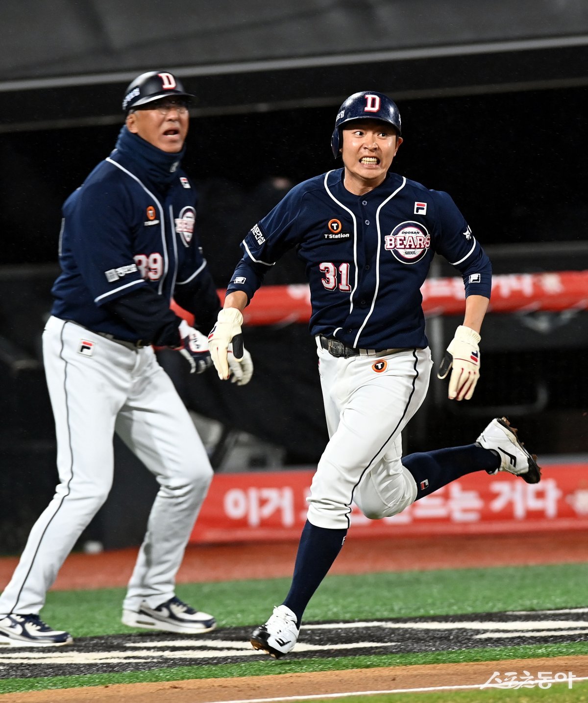 28일 경기도 수원 KT위즈파크에서 ‘2024 신한 SOL 뱅크 KBO리그’ KT 위즈와 두산 베어스의 경기가 열렸다. 3회초 무사 1루에서 3루타 때 두산 정수빈이 홈으로 달리고 있다.