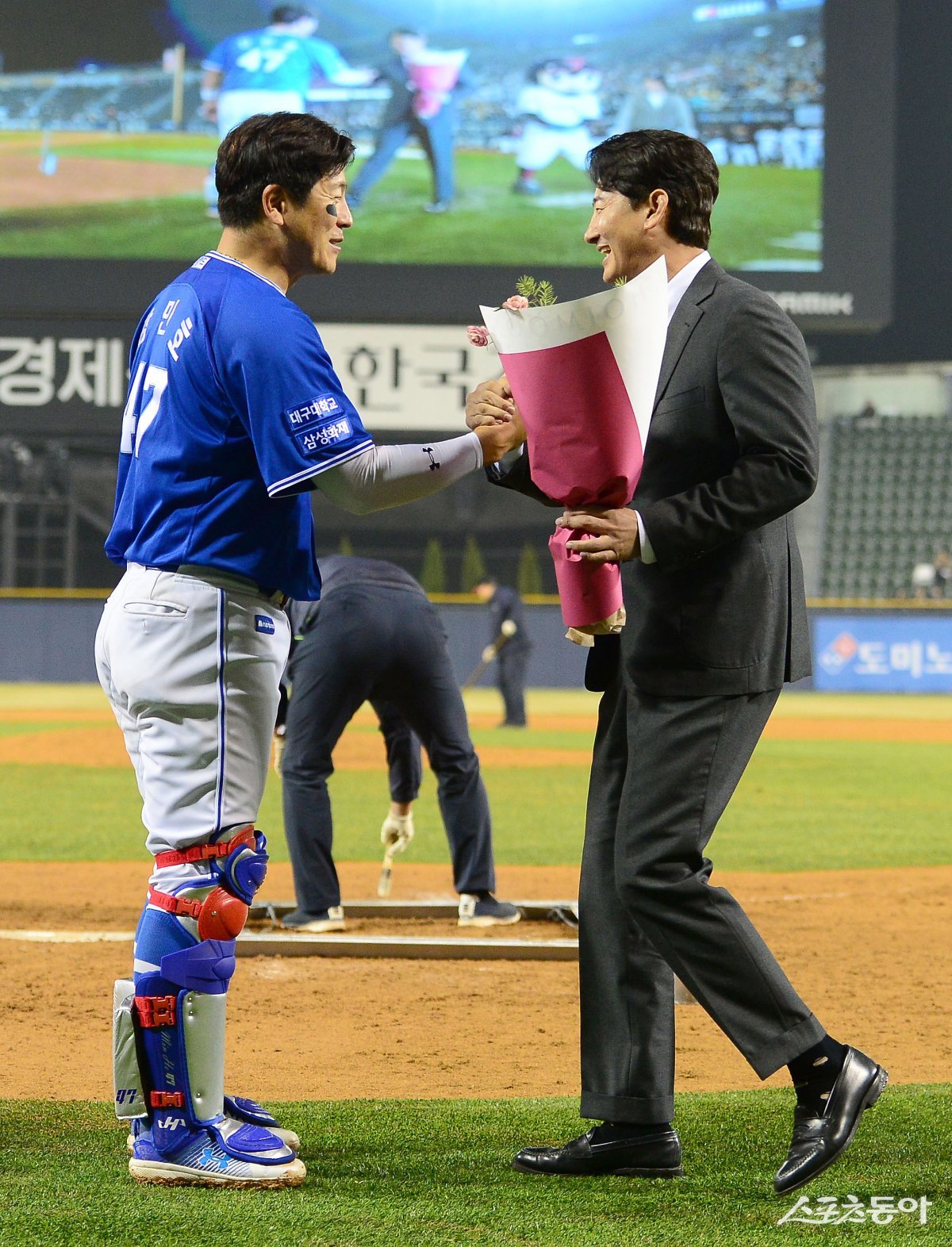 28일 서울 잠실야구장에서 ‘2024 신한은행 SOL뱅크 KBO리그’ 삼성 라이온즈와 LG 트윈스 경기가 열렸다. KBO리그 역대 최다 경기 출전(2238경기) 신기록을 달성한 삼성 강민호가 박용택 해설위원에게 꽃다발을 받고 있다.