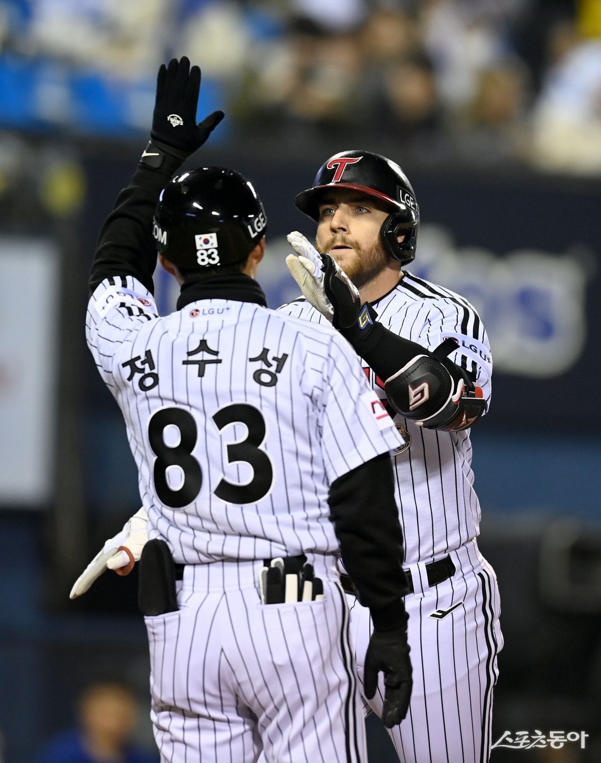 28일 서울 잠실야구장에서 ‘2024 신한은행 SOL뱅크 KBO리그’ 삼성 라이온즈와 LG 트윈스 경기가 열렸다. 3회말 2사 2루 LG 오스틴이 좌월 투런 홈런을 날리고 그라운드를 돌아 홈인해 하이파이브 하고 있다.