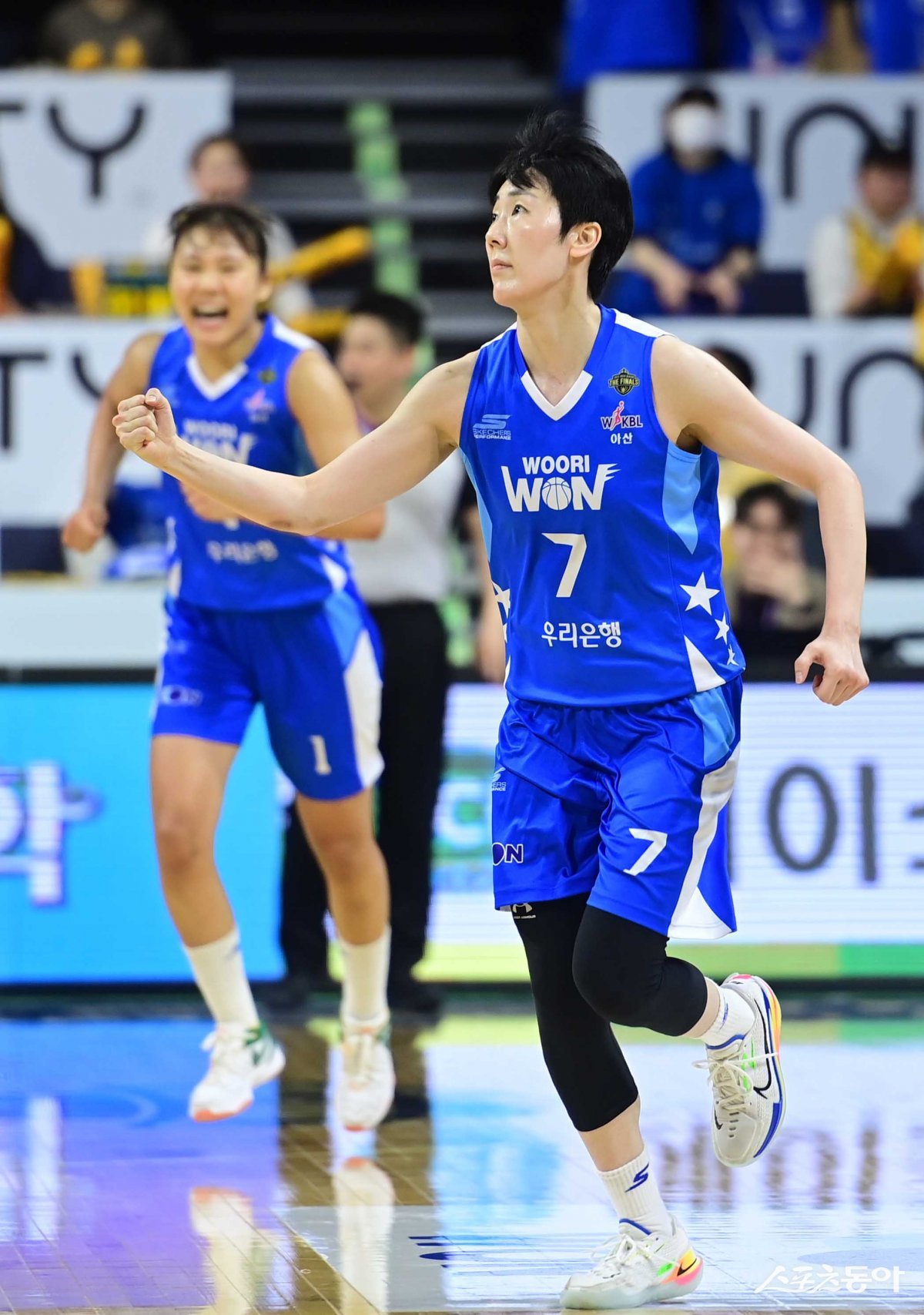 28일 충남 아산이순신체육관에서 열린 ‘우리은행 우리WON 2023-2024 여자프로농구’ 챔피언 결정전 3차전 아산 우리은행과 청주 KB의 경기에서 3점슛을 성공시킨 우리은행 박혜진이 세리머니를 하고 있다.