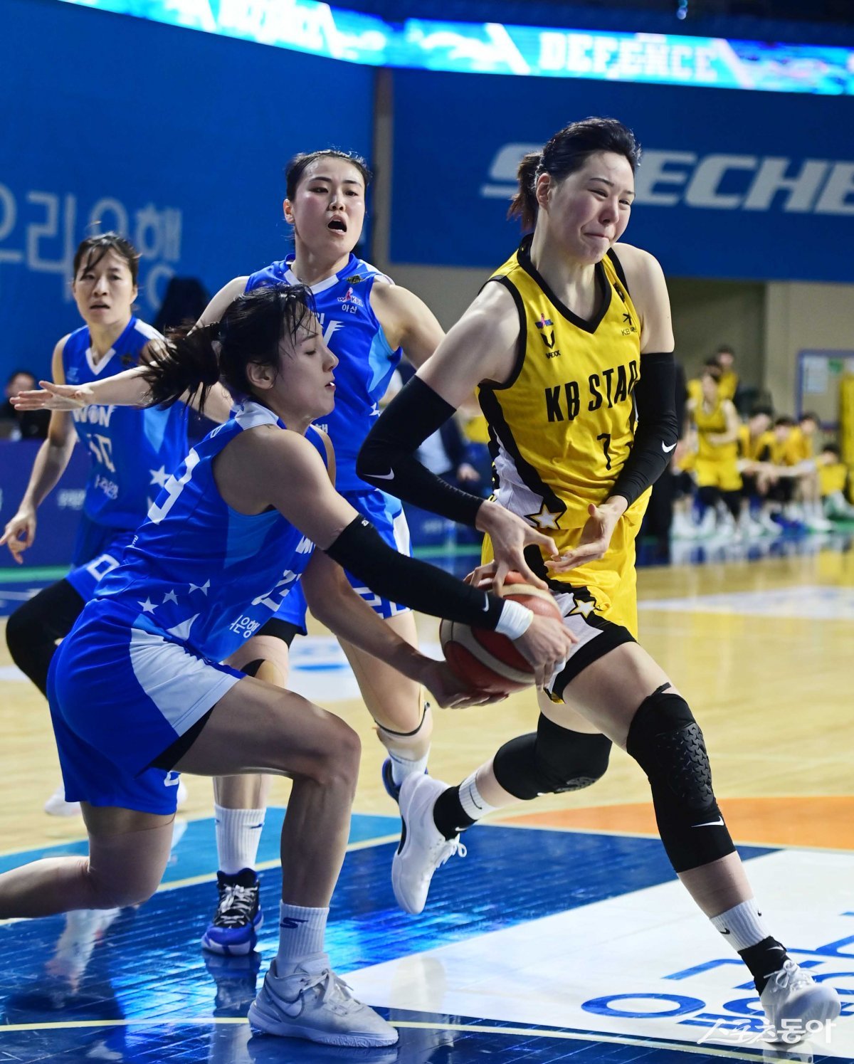 28일 충남 아산이순신체육관에서 열린 ‘우리은행 우리WON 2023-2024 여자프로농구’ 챔피언 결정전 3차전 아산 우리은행과 청주 KB의 경기에서 우리은행 김단비가 KB 박지수의 볼을 뺐고 있다.