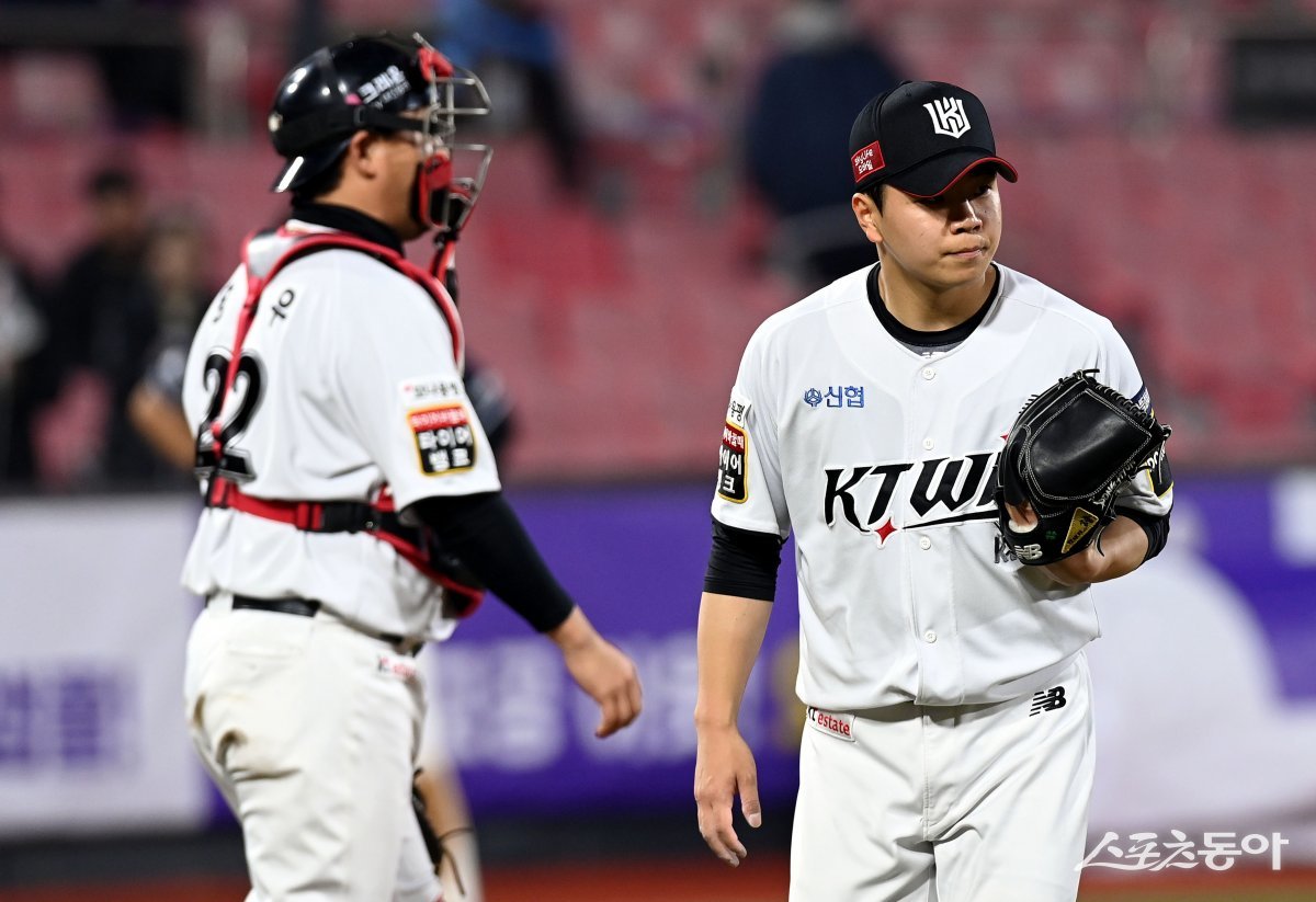 28일 경기도 수원 KT위즈파크에서 ‘2024 신한 SOL 뱅크 KBO리그’ KT 위즈와 두산 베어스의 경기가 열렸다. 8회초 1사 만루에서 KT 손동현이 교체되고 있다.
