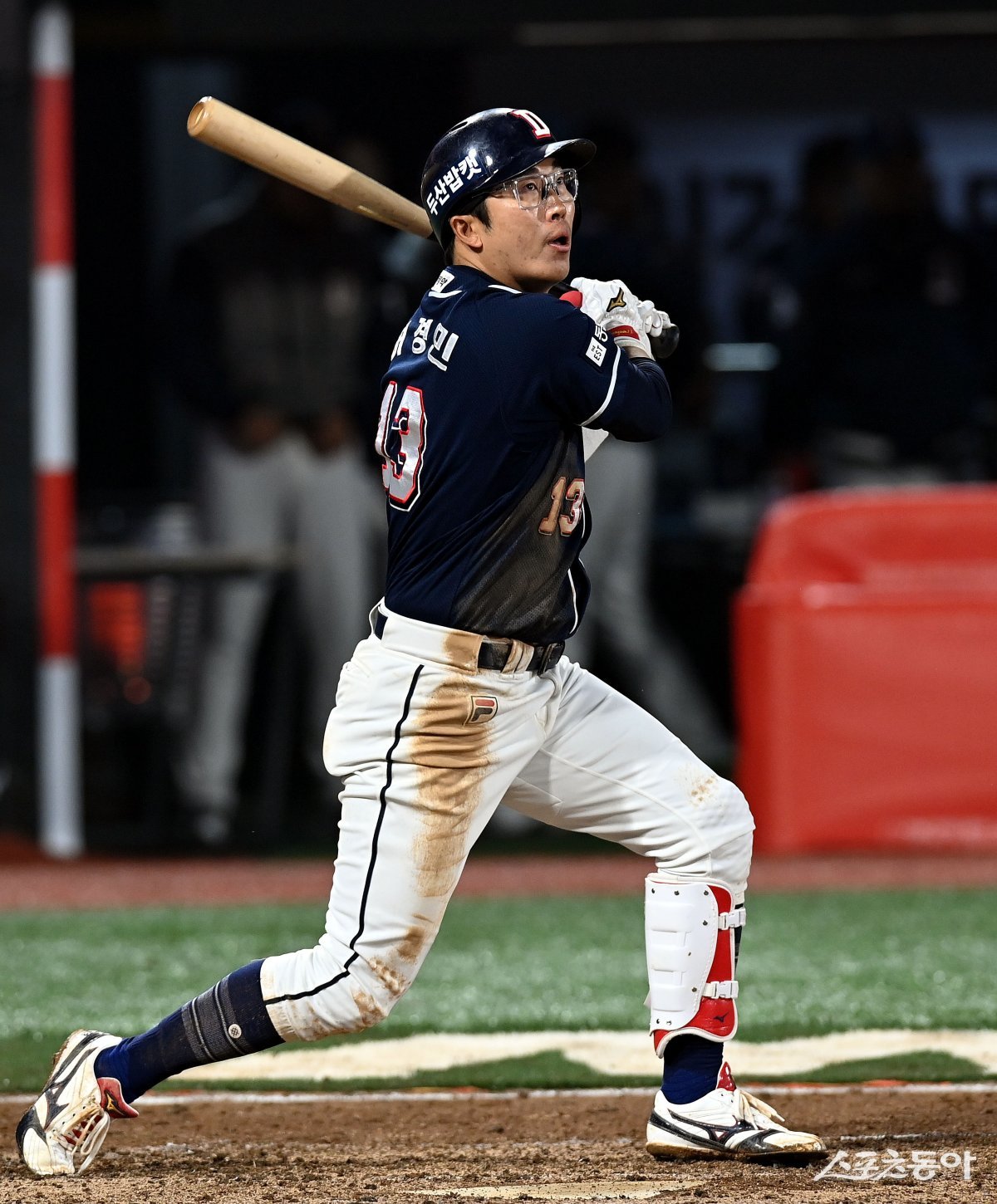 28일 경기도 수원 KT위즈파크에서 ‘2024 신한 SOL 뱅크 KBO리그’ KT 위즈와 두산 베어스의 경기가 열렸다. 8회초 무사 만루에서 두산 허경민이 2타점 동점 적시타를 날리고 있다.