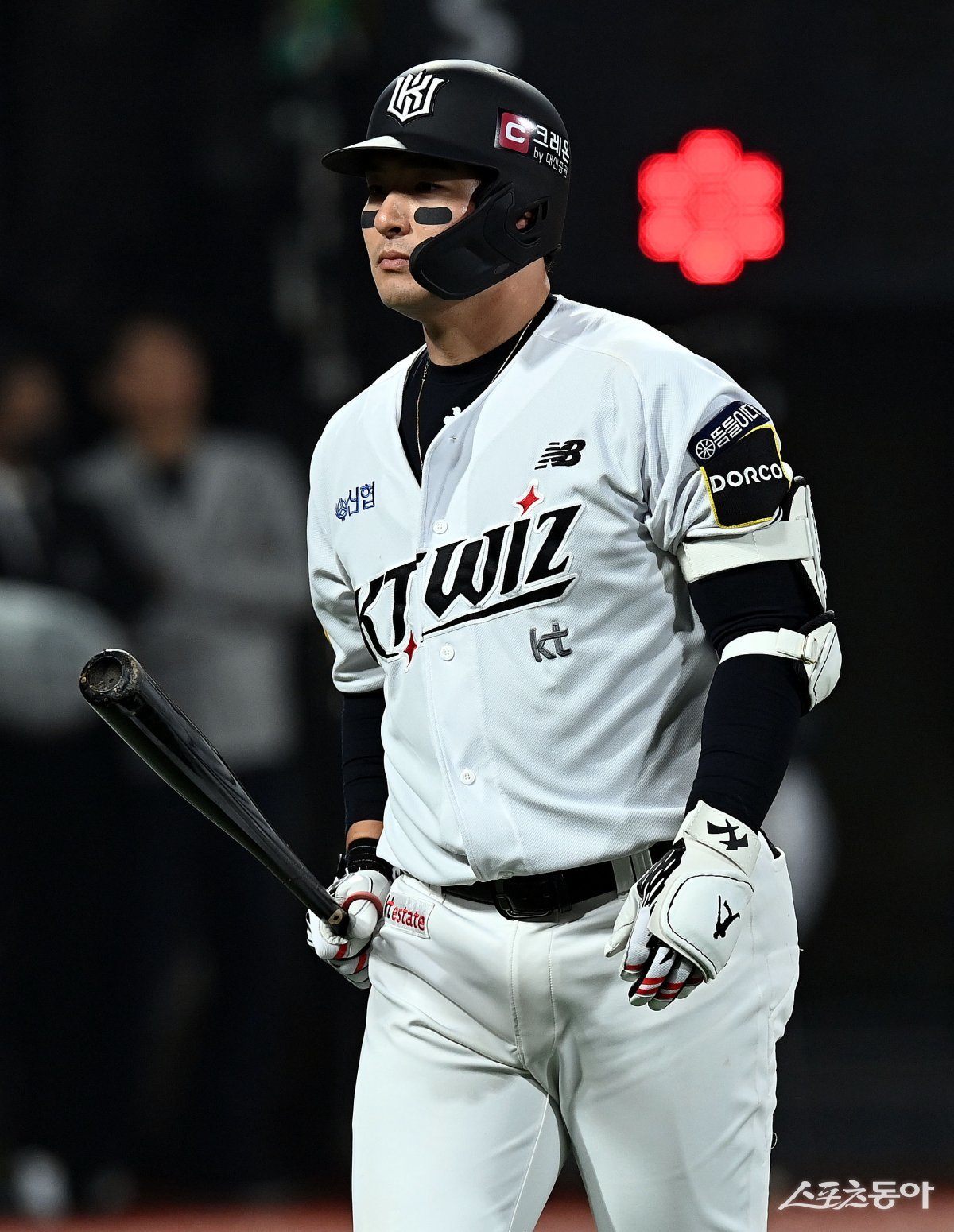 28일 경기도 수원 KT위즈파크에서 ‘2024 신한 SOL 뱅크 KBO리그’ KT 위즈와 두산 베어스의 경기가 열렸다. 8회말 무사에서 KT 박병호가 삼진 아웃으로 물러나고 있다.