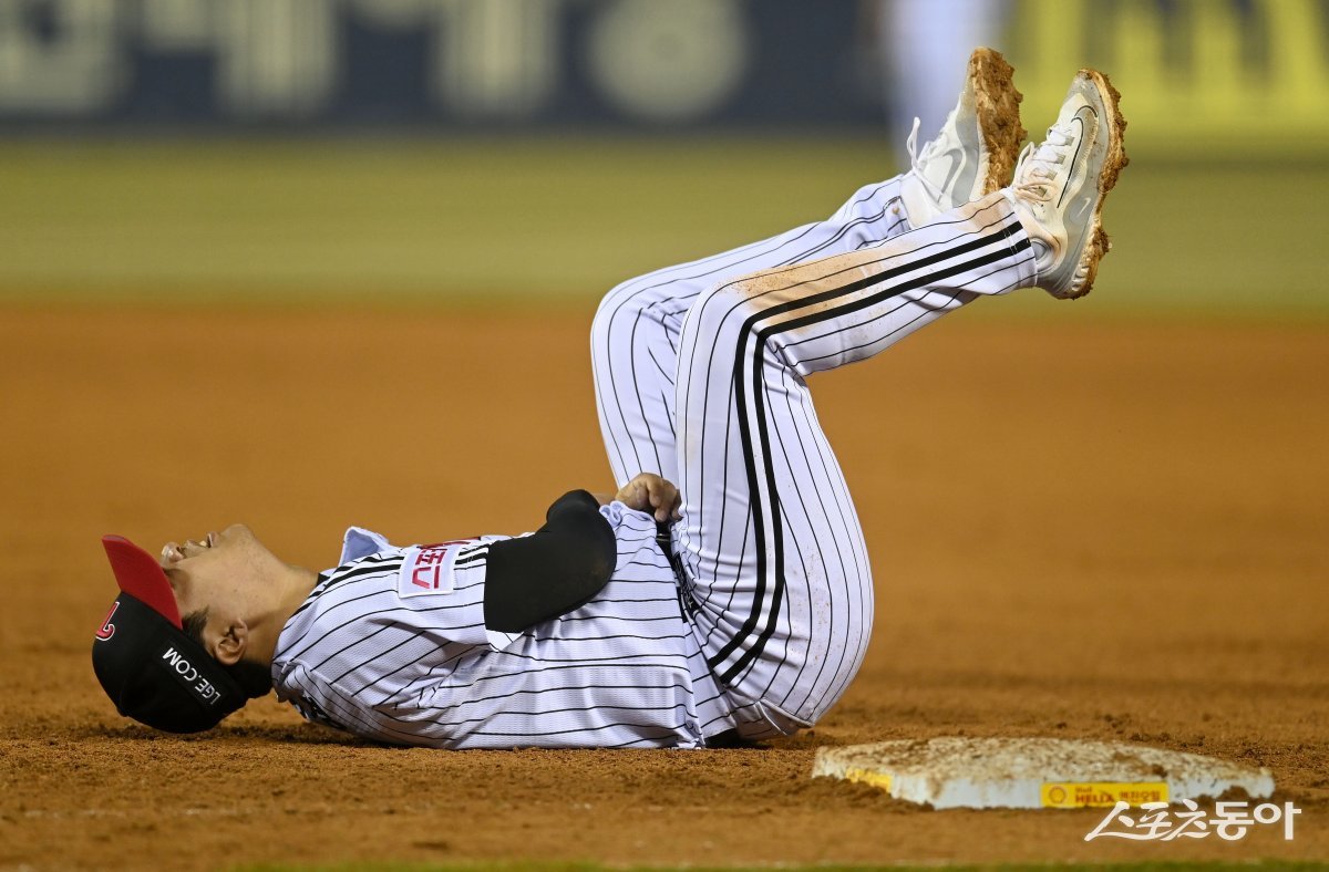 28일 서울 잠실야구장에서 ‘2024 신한은행 SOL뱅크 KBO리그’ 삼성 라이온즈와 LG 트윈스 경기가 열렸다. 9회초 LG 문보경이 수비를 하다 부상을 당해 고통스러워하고 있다.