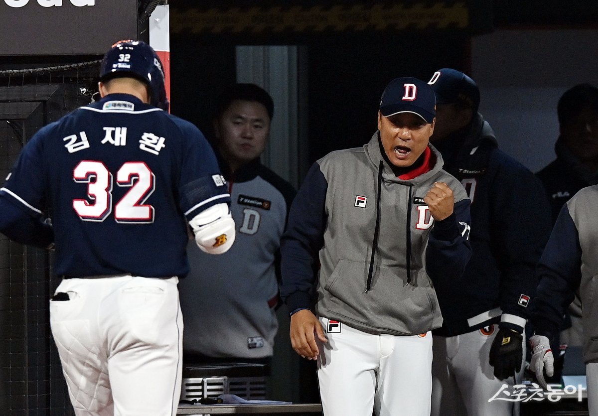 28일 경기도 수원 KT위즈파크에서 ‘2024 신한 SOL 뱅크 KBO리그’ KT 위즈와 두산 베어스의 경기가 열렸다. 9회초 1사에서 두산 김재환이 솔로 홈런을 쏘아 올린 후 이승엽 감독의 환영을 받고 있다.