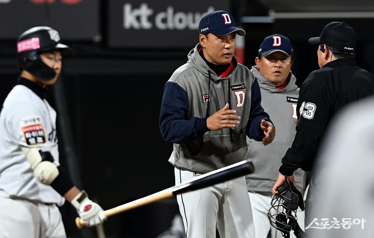 28일 경기도 수원 KT위즈파크에서 ‘2024 신한 SOL 뱅크 KBO리그’ KT 위즈와 두산 베어스의 경기가 열렸다. 8회말 2사 2, 3루에서 KT 정준영의 번트 타구에 대해 두산 이승엽 감독이 심판에게 항의하고 있다.