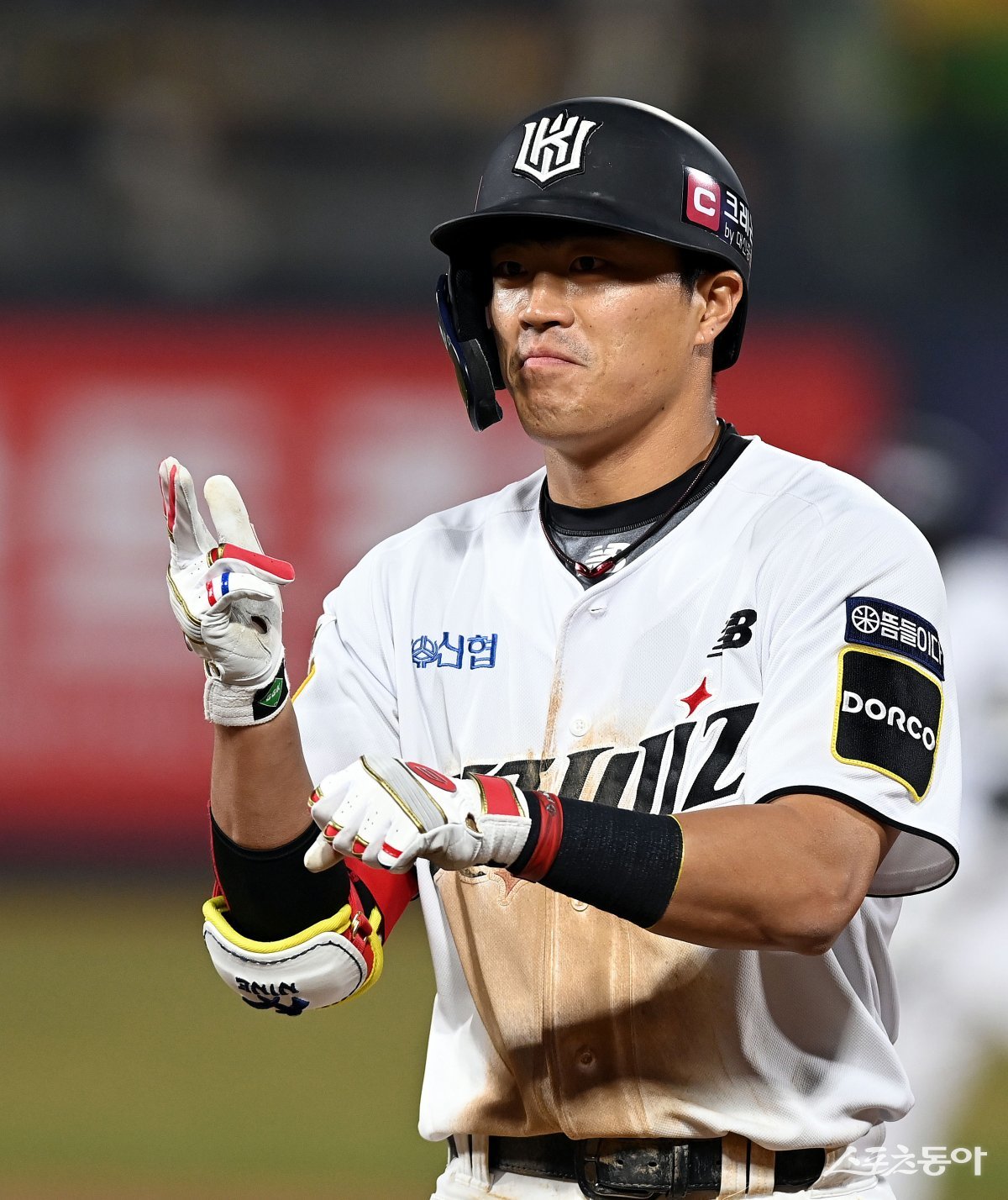 28일 경기도 수원 KT위즈파크에서 ‘2024 신한 SOL 뱅크 KBO리그’ KT 위즈와 두산 베어스의 경기가 열렸다. 9회말 1사 1루에서 KT 천성호가 안타를 날린 후 세리머니를 펼치고 있다.