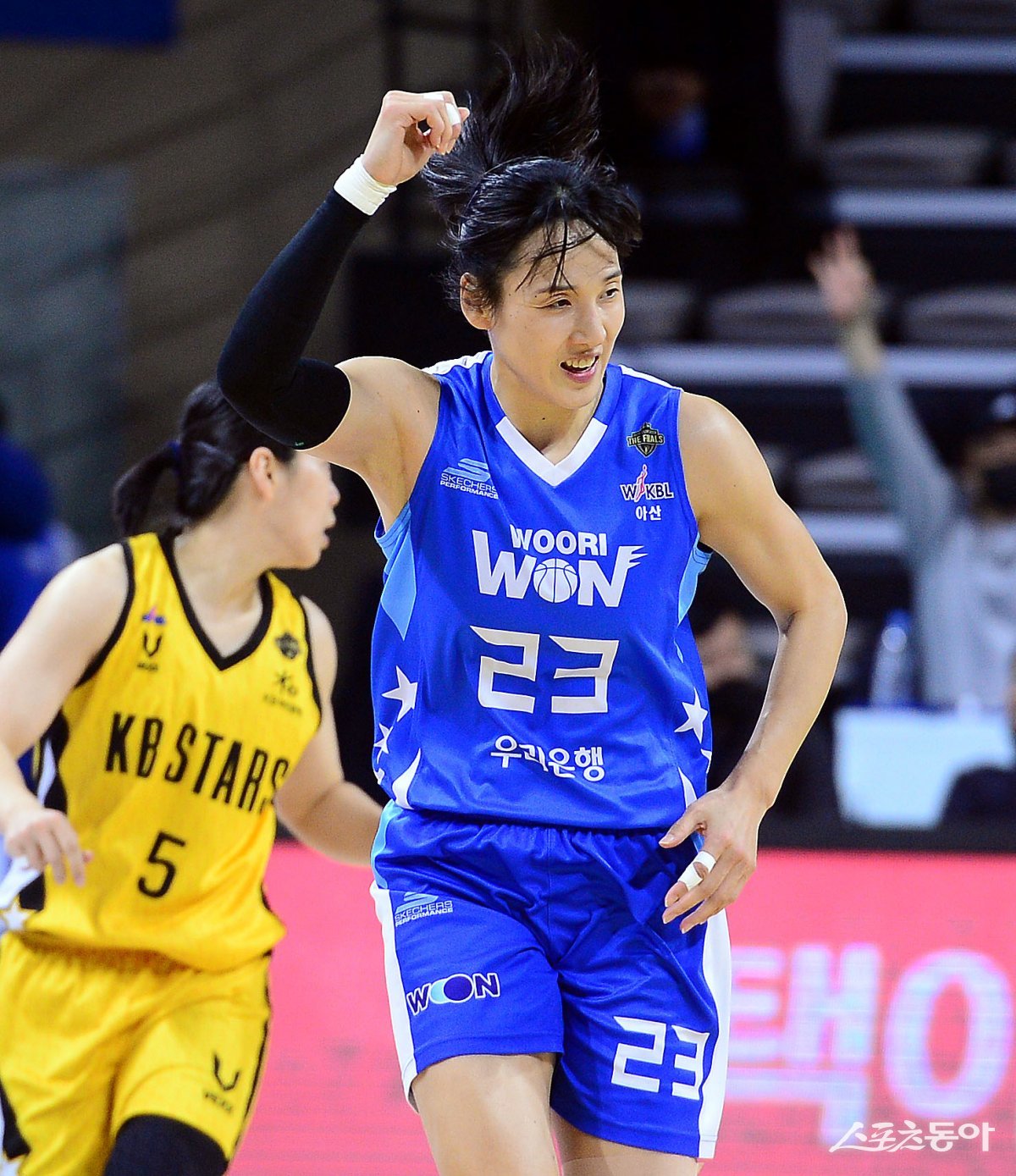 30일 충남 아산 이순신체육관에서 열린 ‘우리은행 우리 WON 2023-2024 여자프로농구’ 아산 우리은행과 청주 KB의 챔피언결정전 4차전 경기에서 우리은행 김단비가 득점을 올린 후 환호하고 있다.