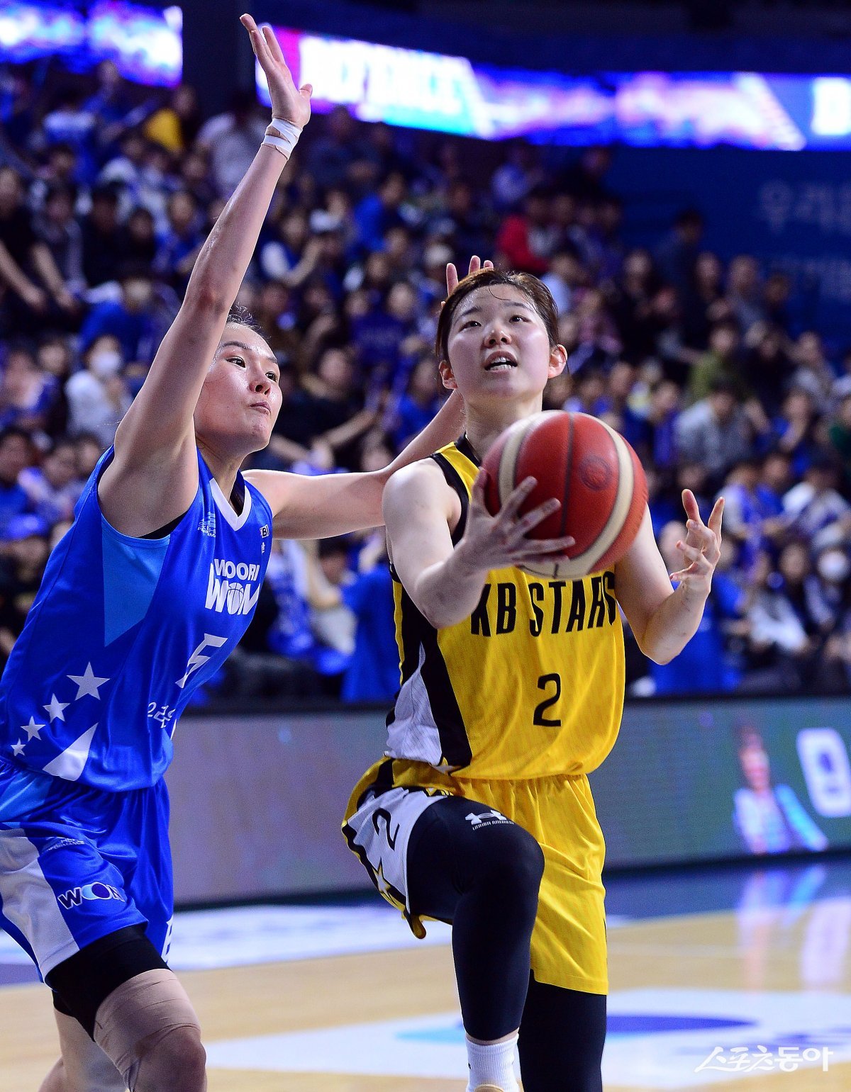 30일 충남 아산 이순신체육관에서 열린 ‘우리은행 우리 WON 2023-2024 여자프로농구’ 아산 우리은행과 청주 KB의 챔피언결정전 4차전 경기에서 KB 허예은이 우리은행 최이샘의 수비를 피해 슛을 쏘고 있다.