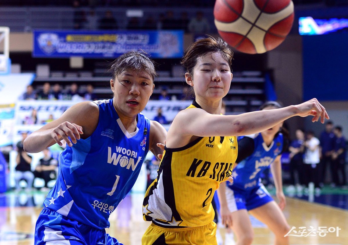 30일 충남 아산 이순신체육관에서 열린 ‘우리은행 우리 WON 2023-2024 여자프로농구’ 아산 우리은행과 청주 KB의 챔피언결정전 4차전 경기에서 KB 허예은이 가로채기를 시도하고 있다.