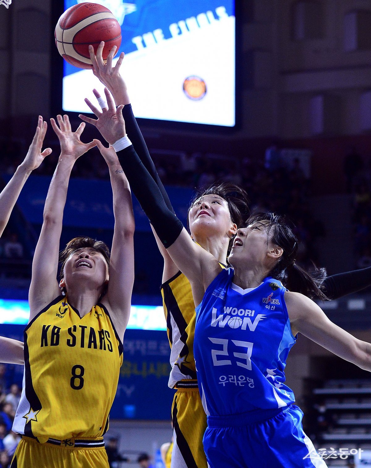 30일 충남 아산 이순신체육관에서 열린 ‘우리은행 우리 WON 2023-2024 여자프로농구’ 아산 우리은행과 청주 KB의 챔피언결정전 4차전 경기에서 KB 박지수가 우리은행 김단비와 리바운드를 다투고 있다.