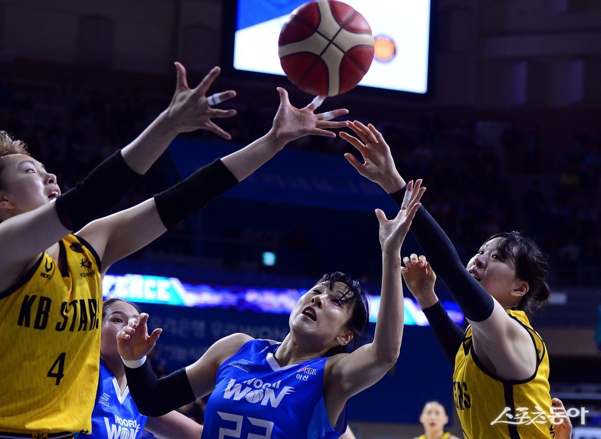 30일 충남 아산 이순신체육관에서 열린 ‘우리은행 우리 WON 2023-2024 여자프로농구’ 아산 우리은행과 청주 KB의 챔피언결정전 4차전 경기에서 양 팀 선수들이 리바운드를 다투고 있다.