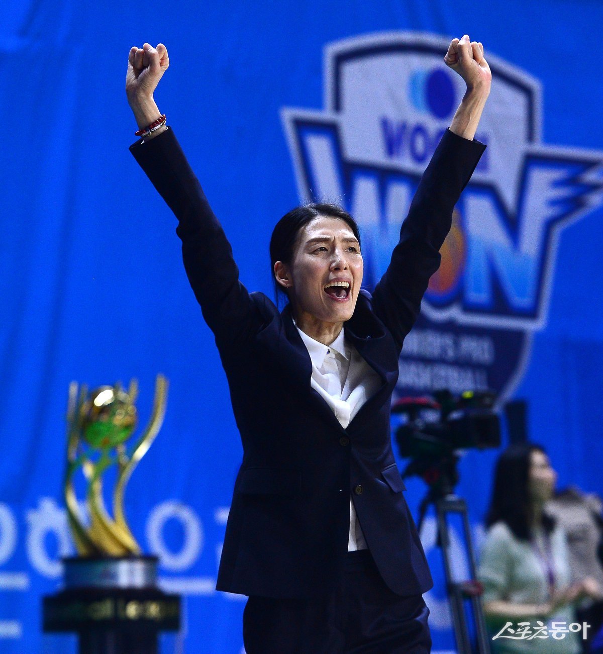 30일 충남 아산 이순신체육관에서 열린 ‘우리은행 우리 WON 2023-2024 여자프로농구’ 아산 우리은행과 청주 KB의 챔피언결정전 4차전 경기에서 우리은행 전주원 코치가 환호하고 있다.